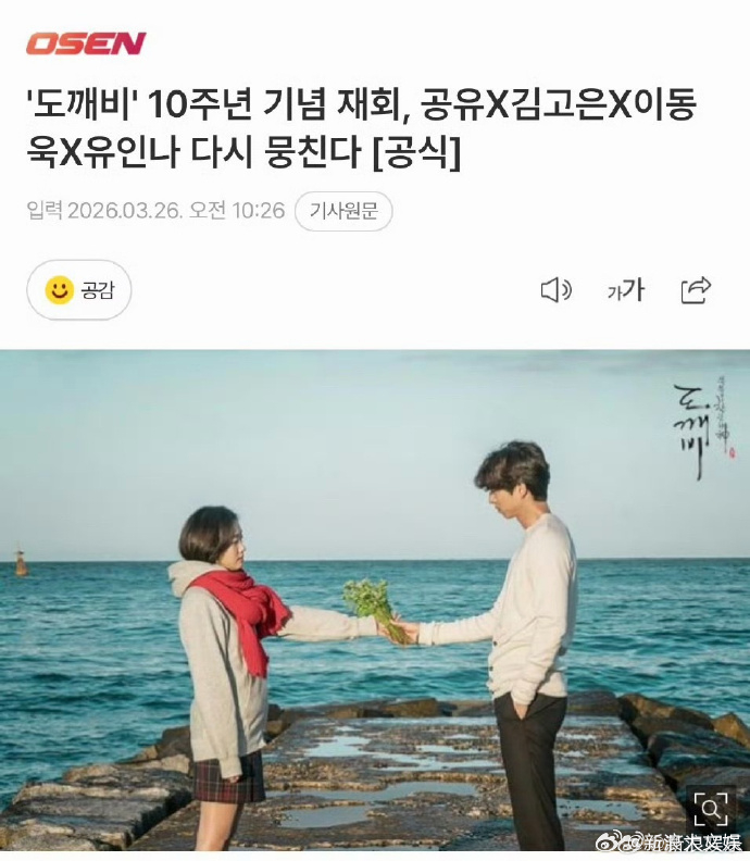 鬼怪全员回归拍十周年特辑 据韩媒,《孤单又灿烂的神:鬼怪》预计今年上半年播出10周年特辑,孔刘、金高银、李栋旭、刘仁娜全员回归,再次聚在一起开始短暂的旅行,回顾经典场面、经典台词和作品留下的特别意义。居然十年了