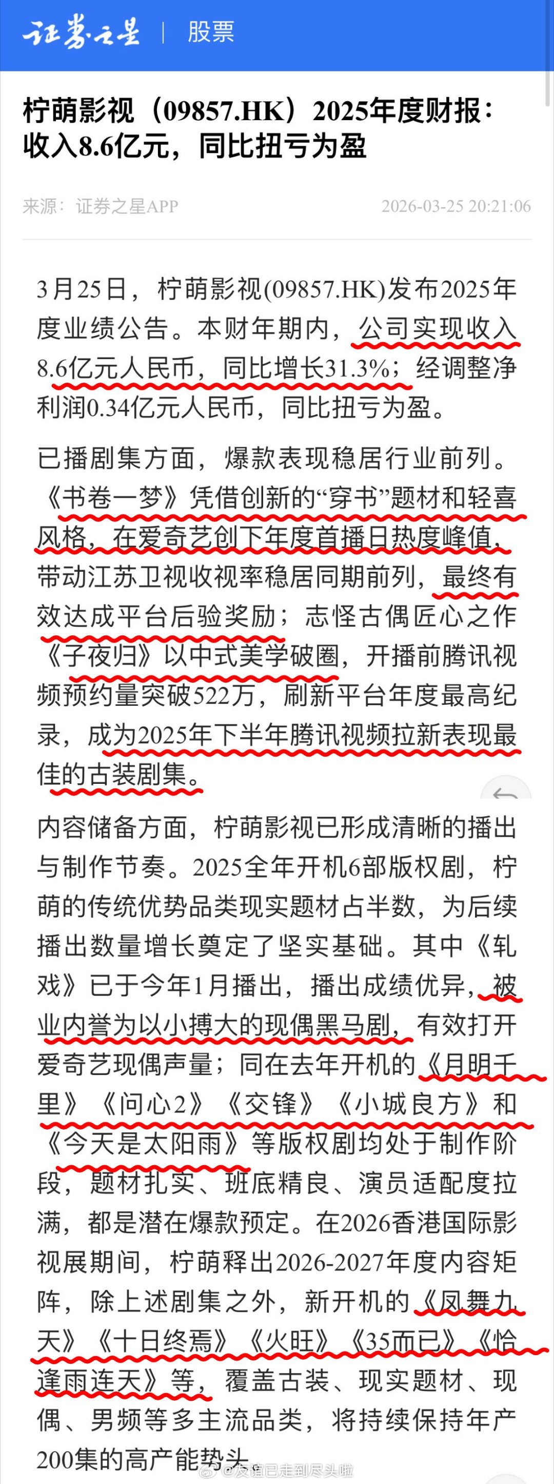 柠萌 2025 财报划重点!年度营收 8.6 亿,同比 2024 年增长 31.3%,全业务板块实现盈利闭环。除《书卷一梦》《子夜归》《三十而已・曼谷篇》三部版权剧贡献核心收入外,海外业务、短剧业务、IP 衍生业务盈利均迎来大幅增长,展现大厂多元变现强实力。寒冬之下更见真章,柠萌去年逆势开机六部剧,以全年 200 集的产能目标,拿下 2025 年全行业开机量榜首。高产能与盈利双在线,足以印证头部影视公司的操盘底气与抗风险实力。值得一提的是,去年开机的《小城良方》《问心 2》《交锋》《今天是太阳雨》等作品,题材扎实、班底精良、演员适配度拉满,都是潜在爆款预定。2026 年柠萌势头不减,开年播出的《轧戏》一举成为爱奇艺认证的小成本黑马剧,不仅口碑热度双丰收,更带动全员资源飞升。新开机的《凤舞九天》凭借顶配演员阵容、质感爆棚的路透图,未播先火引发热议。后续待拍的《十日终焉》《火旺》《刺棠》《恰逢雨连天》等超级大 IP,覆盖古装、现实、现偶三大热门赛道,题材矩阵全面且多元。手握这波硬核储备,柠萌 2026 年盈利增长稳了,未来发展更是值得继续买股!柠萌影视2025年开机量最高柠萌2025年财报盈利