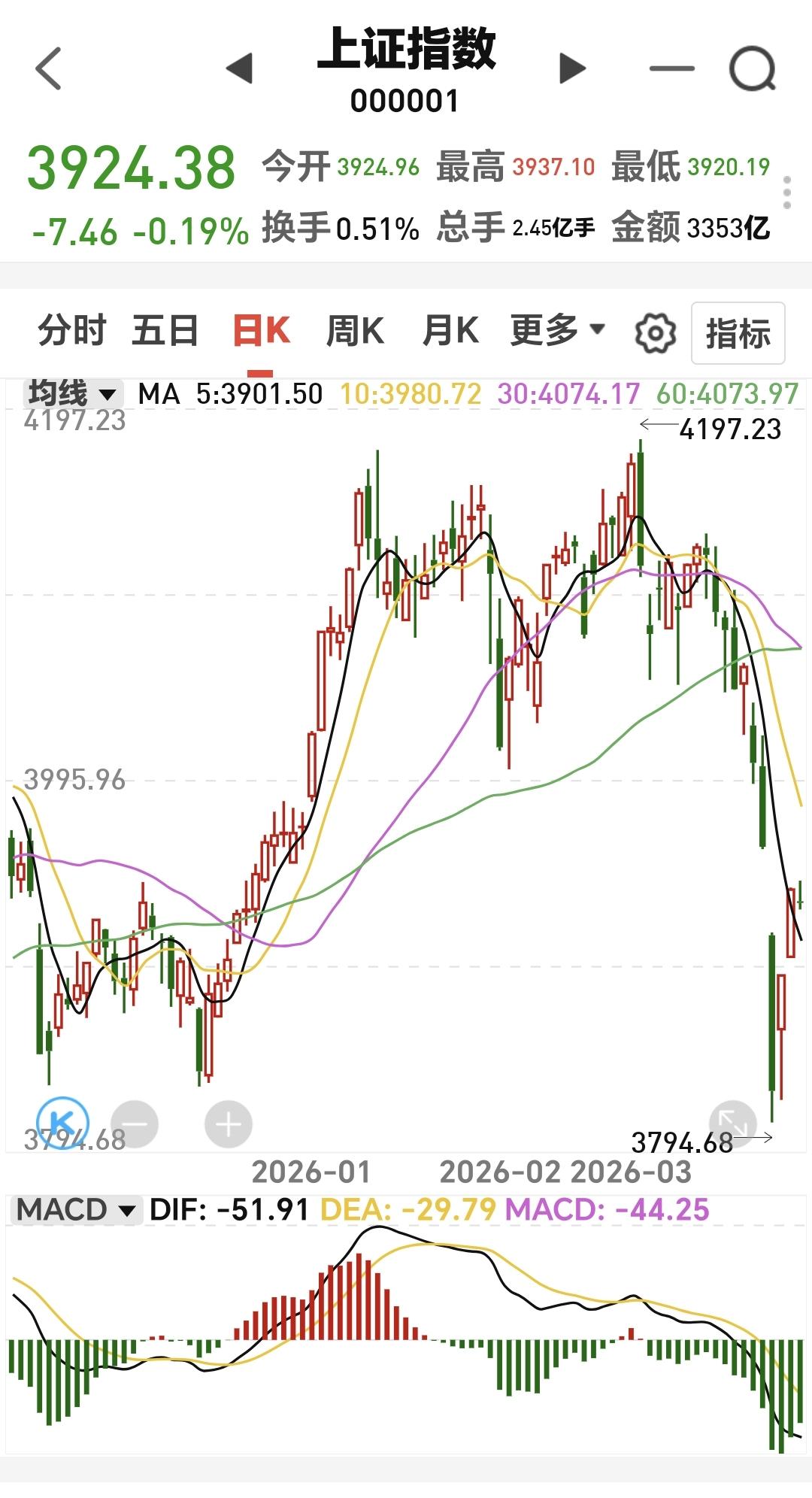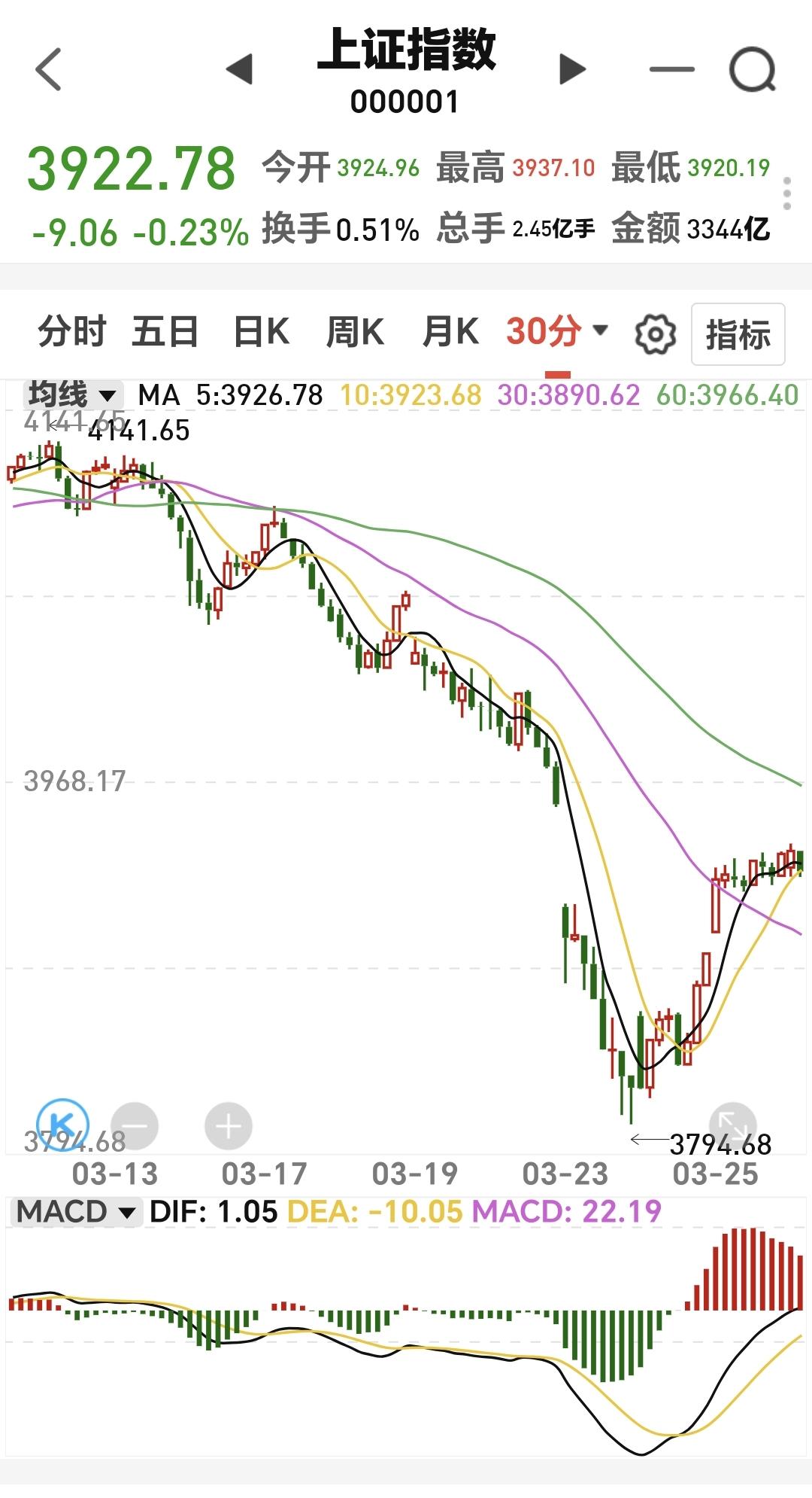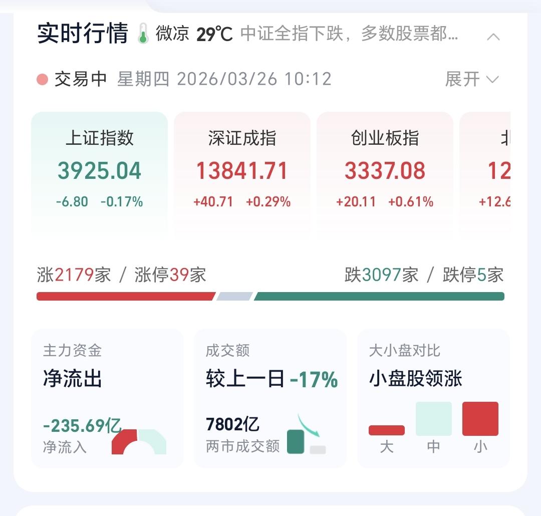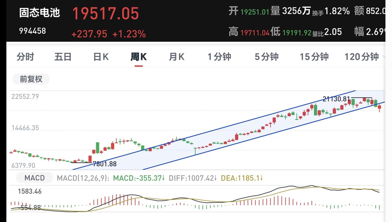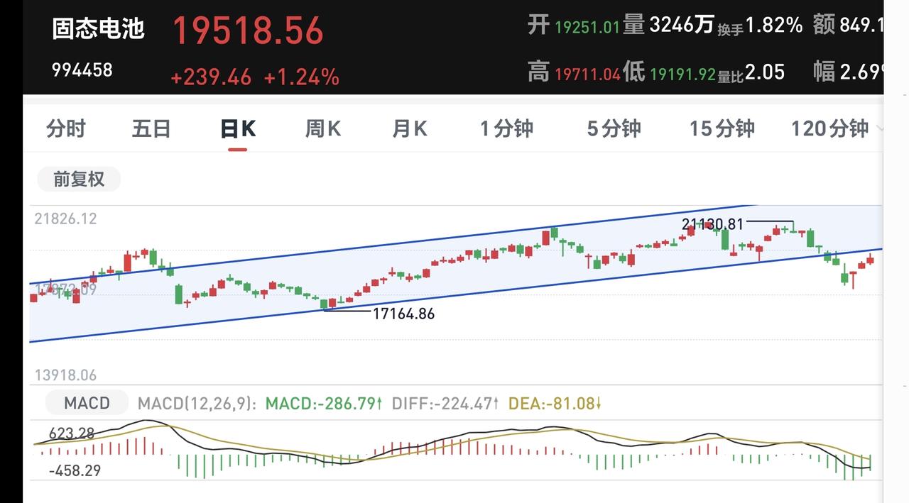 基金:会不会再创新低,需要看回落的速度 今天市场低开以后小幅度震荡,现在三大指数涨跌不一,创业板指和深成指小涨,上证指数小跌,创业板指上涨了0.56%,盘中点位3335点,上证指数下跌了0.22%,盘中点位3923点。 今天黄色线在蓝色线上方带两条线之间的敞口很小,继续观察两条线位置有没有变化,看看黄色线能不能向上拉开与蓝色线的距离,但如果看到黄色线下穿蓝色线,今天的盘面就需要高度注意。 两市累计成交7802亿,相比于昨天同期缩量了17%,市场上涨2179家,下跌3097家,上涨家数少于下跌家数,涨停39家,跌停5家,主力资金净流出235亿。 今天市场大幅度缩量,这并不是一个好现象,不管指数是上涨还是下跌,在现阶段都是需要持续放量的,因为成交量的基数比较低,只有在主升的阶段,才不需要成交量的放大,真正底部区域起涨的时候,最需要的就是成交量的有效放大,没有成交量配合的底部区域,大概率都不是底。 整个市场上涨幅度最大的三个板块是:锂矿板块,固态电池板块,储能板块,下跌幅度最大的三个板块是:电力板块,恒生科技板块,存储芯片板块。 持有基金现在盘中估值亏损了654元,盈利金额最大的三个板块是:创新药板块,新能源汽车板块,创业板指,亏损金额最大的三个板块是:证券板块,芯片半导体板块,白酒板块。 连续两个交易日大涨之后,今天来一个震荡走势是很正常的,到现在为止还不能确定反弹已经结束,当然也不能确定反转已经到来,只要指数保持在3955点至3881点之间,就还是在反弹的过程当中,这个时候只能是观望为主。 今天要注意下午两点钟左右,特别是下午两点钟以后会不会回落,那你有可能是反弹结束的时间节点,会不会再创新低需要看这一次回落的速度,如果速度很快,大概率会再创新低,如果回落的速度很慢,再创新低会有难度。 固态电池板块现在盘中估值大涨了2.86%,是连续第三个交易日上涨,持有人数在所有板块当中排名第36位。 固态电池板块日线级别前段时间下跌跌破了日线级别上涨通道的下轨线。最近一段时间都是在这个上涨通道的下方震荡,今天的大涨并没有能够重新回到原来的上涨通道内,今天的大涨并没有能够改变日线级别上涨趋势被破坏的状态。 固态电池板块上周下跌跌破了周线级别上涨通道的下轨线,本周是在上涨通道的下方震荡,连续三个交易日的上涨都没有能够重新回到上涨通道内,现在还处于周线级别上涨趋势的破位中,长线持有的人需要注意风险。 继续观察盘面的走势,会根据市场真实的走势来做出操作策略,有观点以后会第一时间分享给大家。 置顶的是我参加活动的一篇文章,到现在为止点赞还不到2000,1万多人看了,连2000的点赞量都没有,粉丝的质量值得怀疑,我应该去别的赛道创作,基金赛道的人大多数都不愿意点赞,是不是这个赛道的人都是很自私。