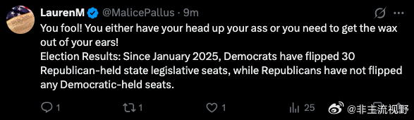 2025年1月以来,美国民主党已经翻转了30个由共和党控制的州立法席位,而共和党没有翻转任何由民主党控制的席位,这些都是美国的传统盟友喜闻乐见的事情。