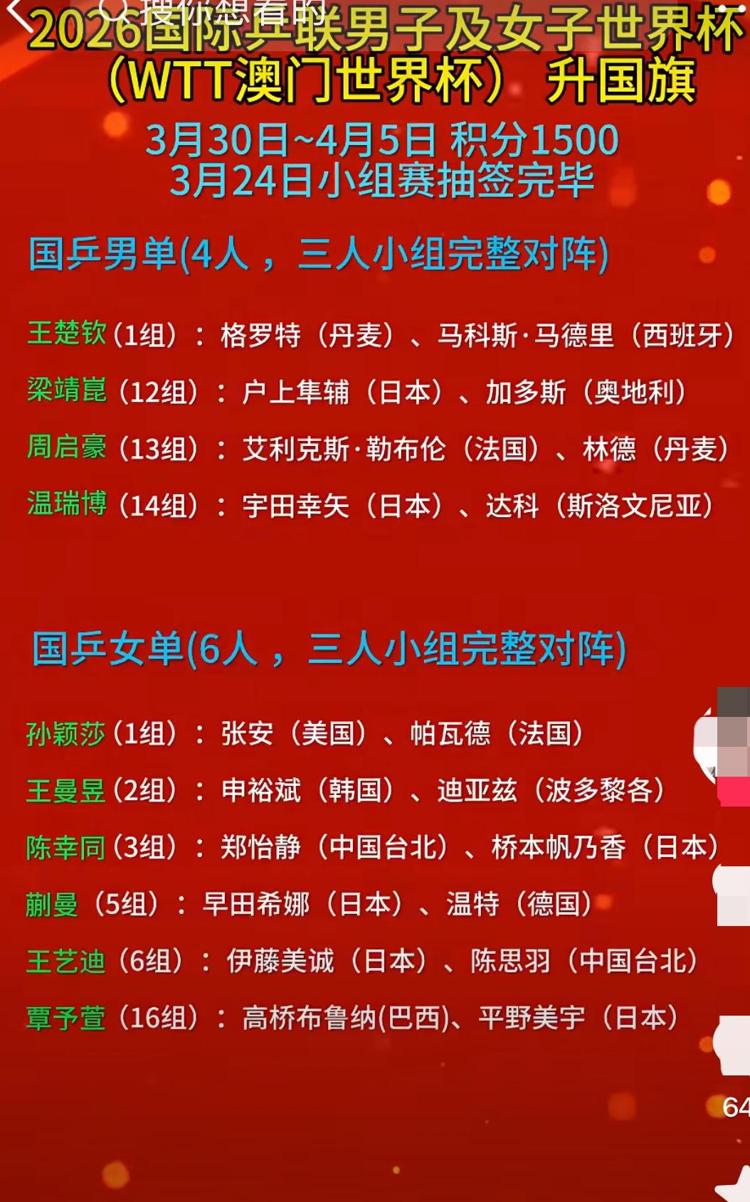 即将到来的3月30日至4月5日2026乒乓球澳门世界杯赛事信息早知道: 中国队