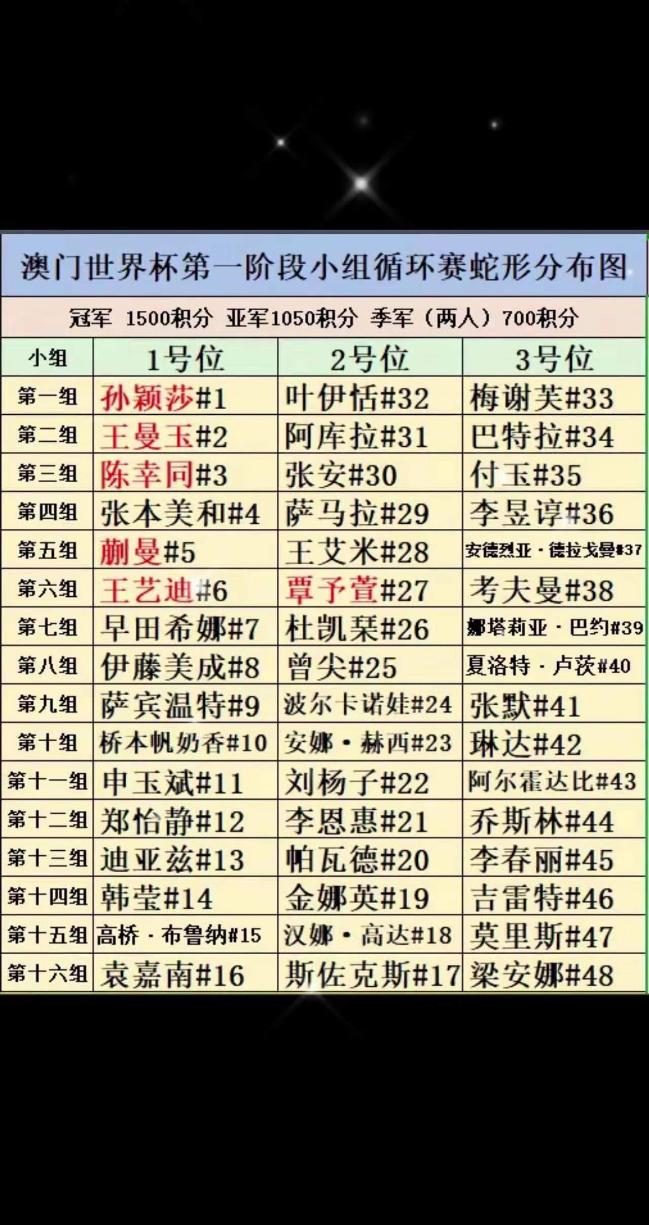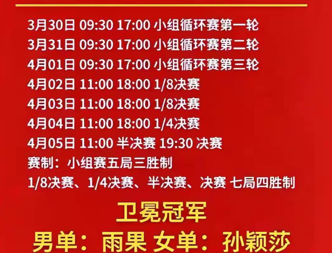 即将到来的3月30日至4月5日2026乒乓球澳门世界杯赛事信息早知道: 中国队的参赛选手,男单五名,女单六名。 3月30日至4月1日是小组循环赛,4月2日至4月4日是八分之一决赛到四分之一决赛,最令人瞩目的半决赛和决赛将在4月5日精彩呈现。小组赛的赛制是五局三胜制,从八分之一决赛开始的赛制是七局四胜制。上一届的冠军,男单是雨果,女单是孙颖莎。 3月24日,小组赛抽签已完毕,三人小组的完整对阵新鲜出炉,中国队种子选手的对阵方有强有弱,赛场风云,变幻莫测,期待国乒选手都能顺利晋级!