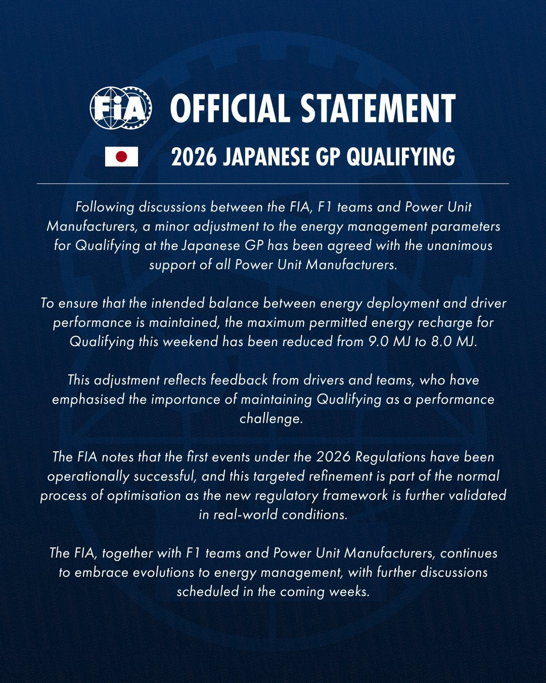 FIA国际汽联官方宣布:经过FIA国际汽联、F1车队和各家动力单元制造商讨论,在各家动力单元制造商的一致支持下,本周F1日本🇯🇵大奖赛排位赛的能量管理参数将进行微调。