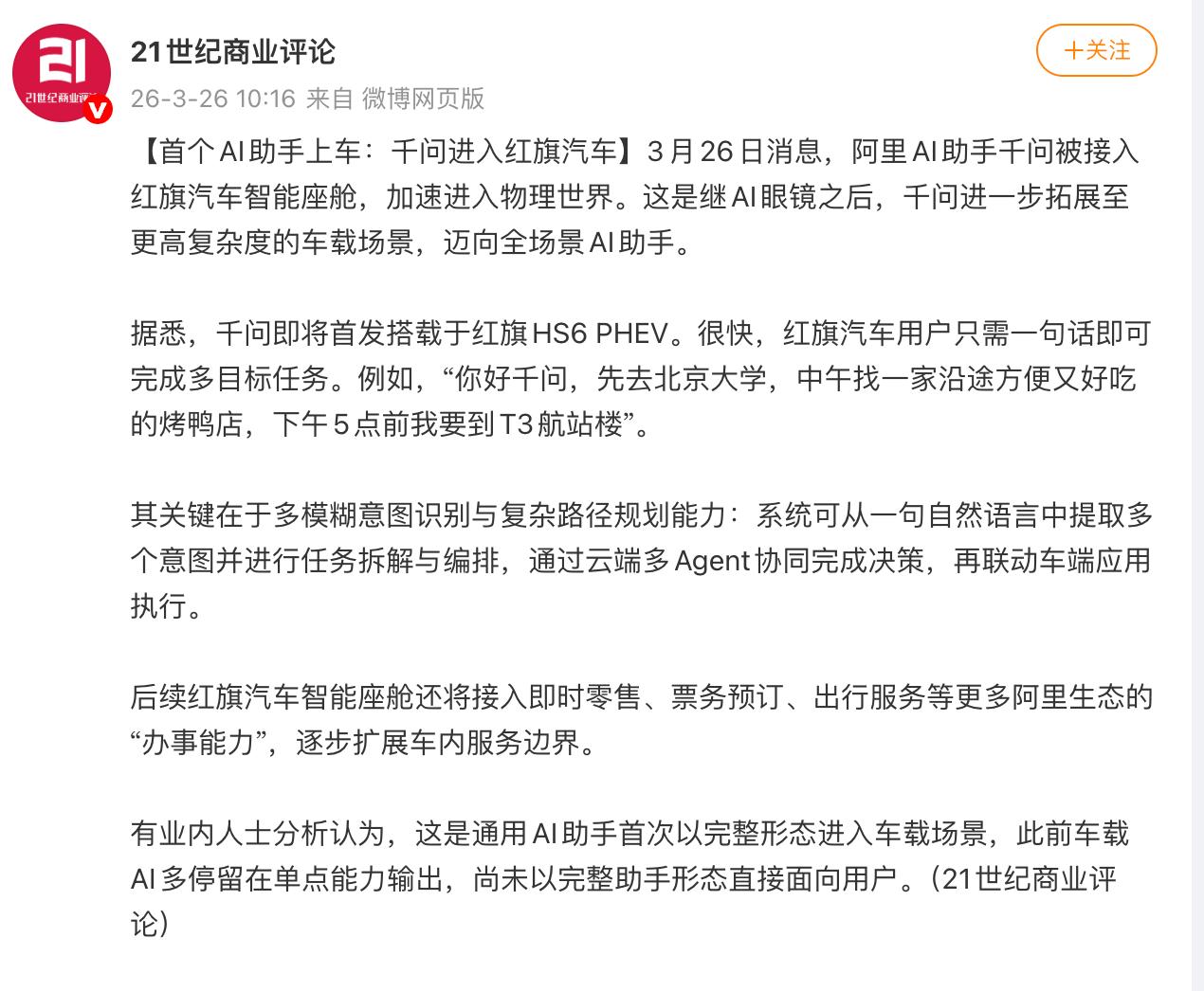 国车就该配国产AI,这场“灵魂绑定”让中国智驾站上新牌桌! 特斯拉有Grok,咱们中国的“国车”红旗,现在也有了属于自己的最强AI大脑——千问。 3月26日,千问AI助手正式首发上车,登陆红旗智能座舱。这可不是一次普通的车载应用入驻,而是从手机、PC到眼镜,再到汽车,千问正在完成一次面向全场景的“版图扩张”。当越来越多终端被AI重新定义,汽车作为其中场景最复杂、交互门槛最高的空间,自然成了检验AI助手成色的试金石。 千问不仅仅能像Grok 一样陪你聊天,还能帮你办事。 红旗选择千问,本身就是一个强烈的信号。在全球都在比拼“谁家的AI更懂车”的当下,咱们的国车没有犹豫,把智能座舱的灵魂交给了国产AI。这背后既是技术能力的认可,更是生态协同的底气。过去几个月,千问一直在快速迭代AI办事能力,点外卖、买电影票、订机酒、打车这些功能陆续上线,现在这些能力统统被带进了座舱。 以前我们说智能汽车,更多是在谈导航、谈语音控制,但千问上车之后,红旗的座舱开始具备理解复杂需求、参与决策的能力。这不是功能的堆砌,而是体验的重构。从“能用”到“好用”,从“听话”到“懂你”,国车配国AI,这波操作确实稳了。 当智能座舱的竞争从硬件堆料转向AI能力的深度整合,红旗+千问的组合,已经悄悄站上了新牌桌。