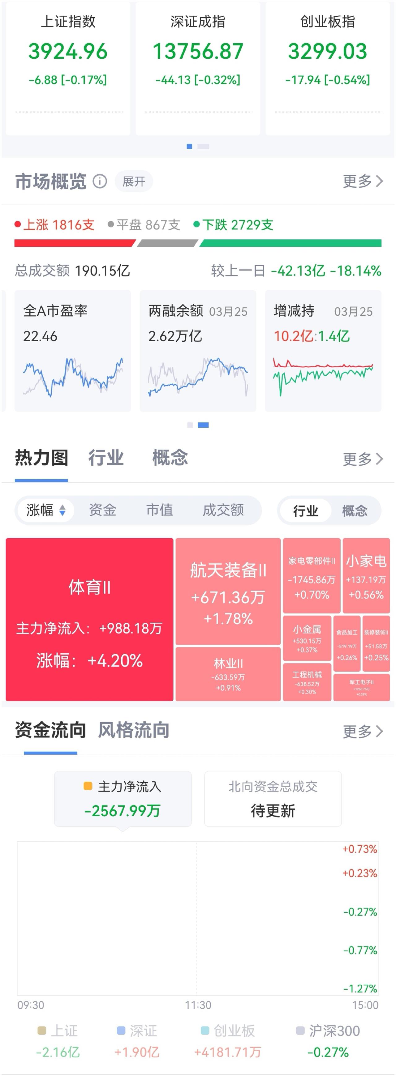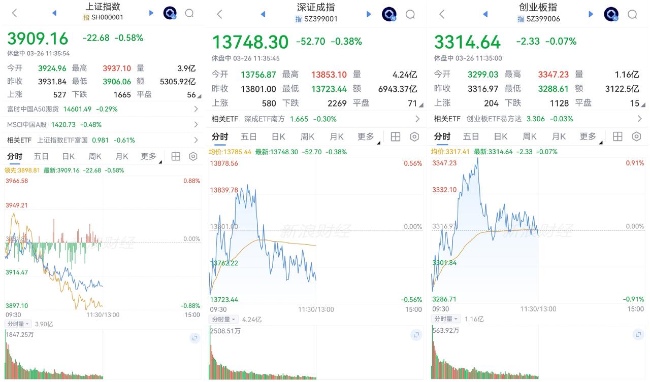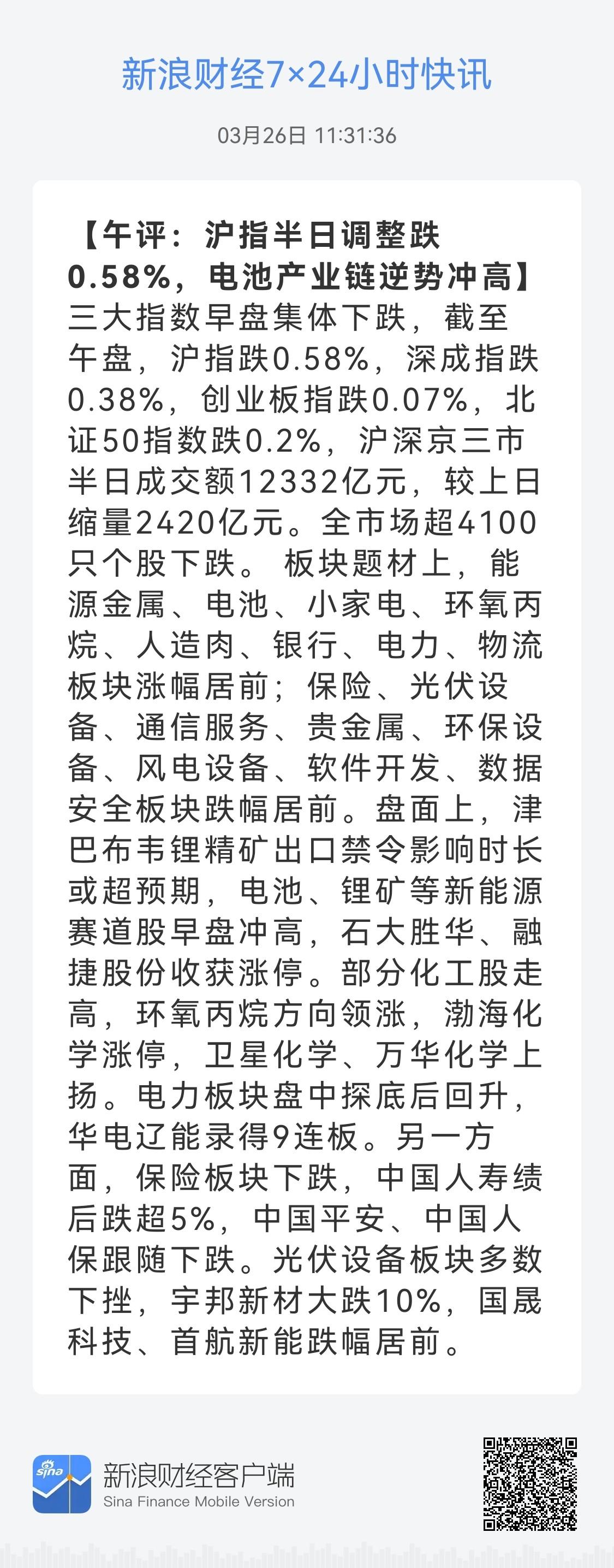 午盘印象(3月26日) 反弹后下跌 等待明确 外围:坚定TACO 美股收红 科技反弹 内股:CPO电池强势 个股震荡又下跌 一、三大股指开绿: 个股开盘涨平跌比率34%:16%:50%。 个股开盘弱势(-17 Vs +49个百分点), 个股高开刚三分之一,连续反弹后谨慎大增 二、早盘指数分化 半日1.2万亿 震荡跳水或冲高回落 三、涨跌幅榜: 科技调整 红利分化 非银调整 跌幅前列:兵装军工、非银、算力 涨幅前列:电池储能、银行、化石能源 四、开盘和午盘: 开盘:沪-0.17%、深-0.32%、创-0.54%。 午盘:沪-0.58%、深-0.38%、创-0.07%。 主板扩大跌幅 创板缩减跌幅 五、午盘个股下跌75%,与昨日涨跌差距( -52 Vs +68个百分点),个股普跌 相比开盘,涨跌差回落,下跌股大幅增加 资金-456 ( +191)亿,资金大幅流出 六、沪深两市成交量午盘12,249亿,上个交易日14,669亿,同比量能萎缩超2,400亿 七、指数个股无力继续反弹,普跌调整 两融4连跌后净增加+32亿。信号大于数值,资金面稍稳定 早盘指数分化,CPO、电池冲高回落,带领创业板冲高又回调。个股跟随上证,震荡后又跳水,无力连续上攻,静等谈判消息明朗 谈判还在焦灼,特朗普骑虎难下又不愿让步,急于抽身应能占据上风。 午后两种情形: 1、横盘震荡:分歧严重,平行震荡,时间换空间。 2、震荡下跌:机构避险再升温,大开大阖,慢牛格局未变。 (图片源自网络侵权告知删除)