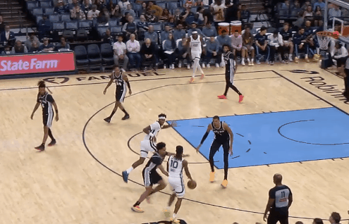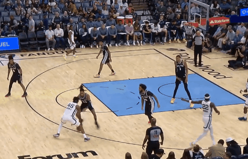 其二,思摩尔推反击,文班先看着右翼,思摩尔不敢传球,推到弧顶,急停三分吧?文班起飞盖掉。