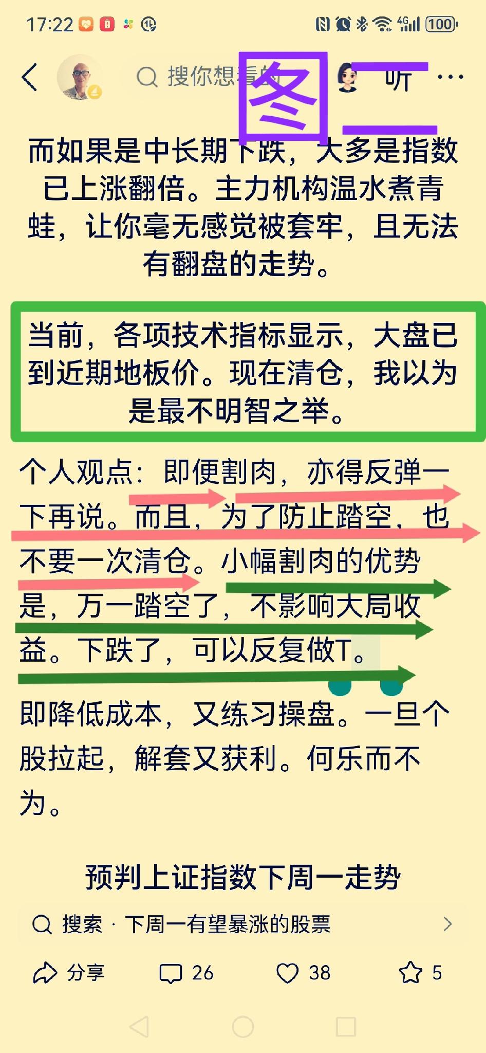 如期而遇。上证指数今天走势与昨天发文预判上半程基本相同。参看下面昨天预判截图一。 3月21日发文预判:未来大盘大概率会走穹顶走势。目前,大盘位置刚好卡在上下跳空缺口之间。通过反复复盘分析,我认为:指数现在这个位置,有可能会成为大盘穹顶震荡区间。 下半场,大盘大概率是冲高回落走势。继续维持昨天预判观点,尾盘收阴。 接下来本人操盘策略依然坚持本周一操作。参看下面截图二。 以上观点,仅供参考。对错自斟。