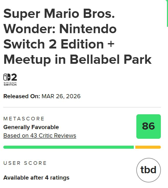 《超级马力欧兄弟 惊奇 Switch 2版+同游铃铃公园》Metacratic网站媒体评分现已出炉,现有43家媒体给出了均分86分的评分。