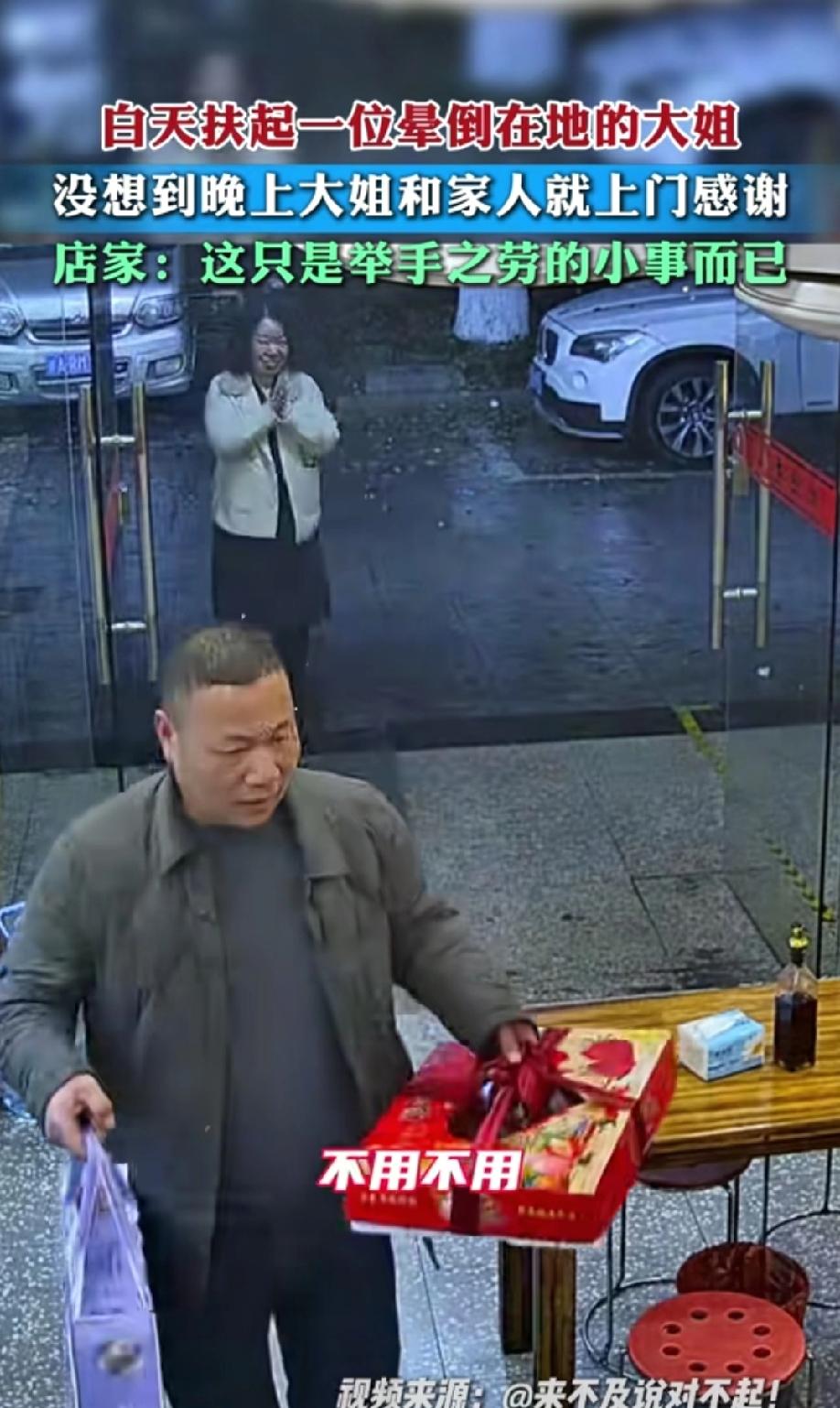 换你你扶不扶?3月25日的浙江,一位大姐带着家里人,提了水果去一家餐馆,不为别的,只为了感谢救命之恩。 原来在那天,这位大姐突然晕倒在路上,周围的行人看了两眼后,立马从他身旁绕过去,就是没人愿意扶她起来。 这时候,餐馆里的老板娘看到了,慌忙的跑过去,和自己的丈夫一起把她抬起了餐馆里。 老板娘拿起大姐的手机迅速拨通了她家里人的电话,告知大姐现在的情况,让她们赶紧过来。 通过询问得知,大姐中午没有吃饭,估计是低血糖犯了,这才让她晕倒在地。 老板娘赶紧给她喝了一杯糖水,然后让她好好休息,大约半小时之后,她家人来到,带着她去了医院。 所幸大姐没什么大事。 当晚,大姐就带着自己丈夫提着水果来感谢老板娘。 最让人泪目的是,大姐刚到门口,就已经双手合十的看着老板娘,眼神里都是对老板娘的感激。 大姐的丈夫也是和讲究人,一边给老板递烟,一边对着老板娘说着感谢。 这种感人的场面真的让人很暖心。 就像春晚里的小品《扶不扶》,老板娘用实际行动证明了,她的人心没倒,她的善良永远刻在骨子里! 让我们为这样善良人点赞。 对此大家怎么看,你们扶过人吗? 浙江暖心大姐