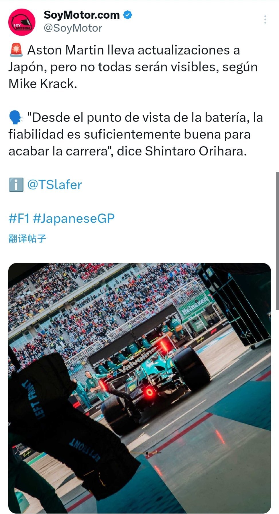 阿斯顿·马丁和本田的联合新闻发布会上,折原慎太郎发言:“我们的目标是完成比赛,本周F1日本大奖赛对本田来说非常重要。从电池的角度来看,可靠性足以保证我们完成比赛。”F1赛车2026F1日本大奖赛