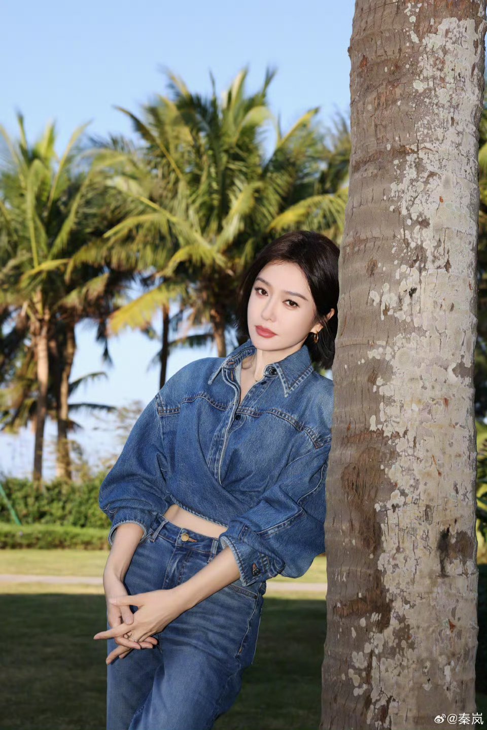 秦岚这腿真的绝了秦岚私服好简约!蓝色衬衫叠穿牛仔短裤,休闲又减龄✨超绝长
