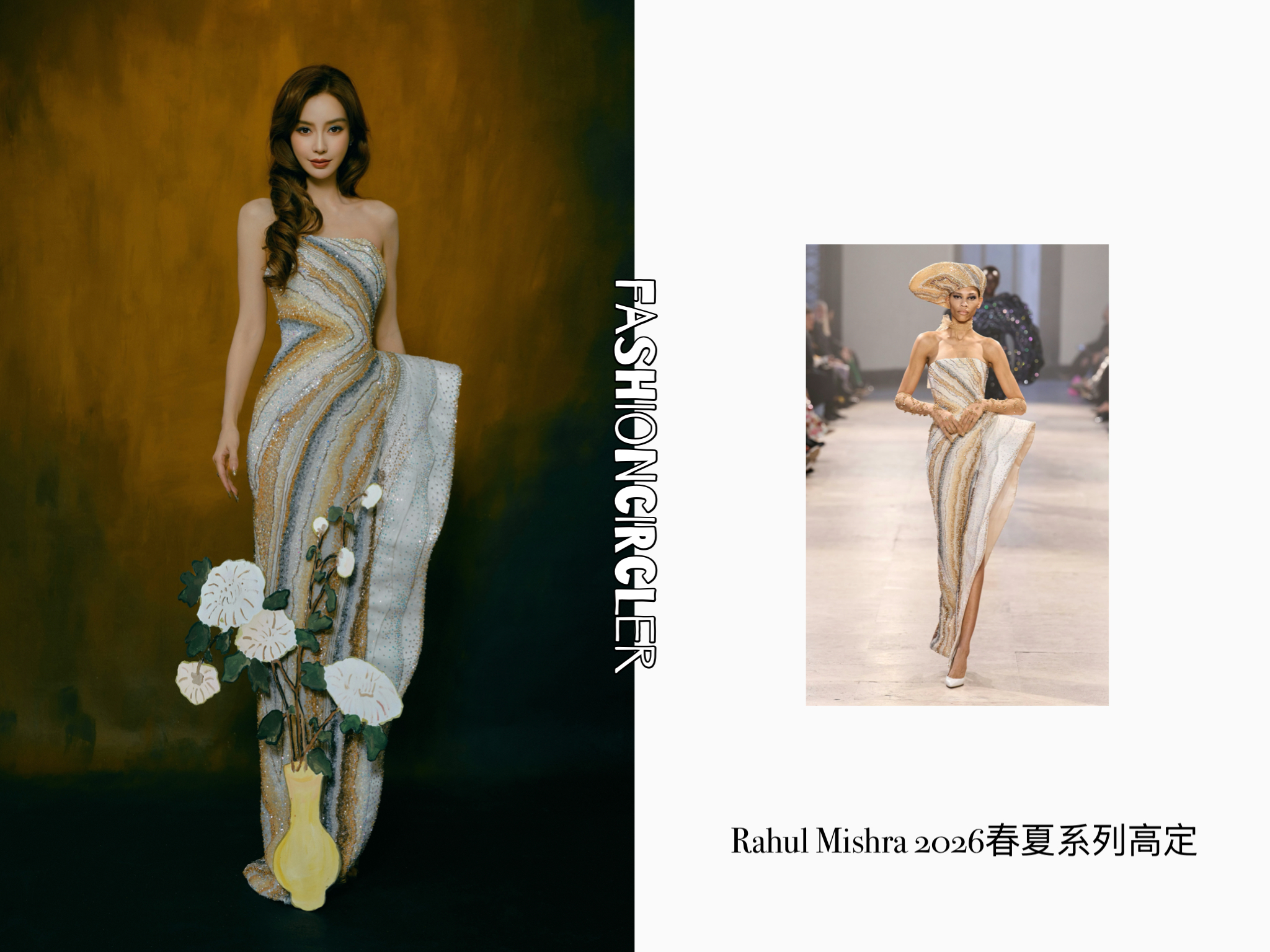 Angelababy出席代言品牌直播活动造型图集,身着Rahul Mishra 2026春夏系列高定抹胸礼服,佩戴全套Fred斐登珠宝,彩色钻饰亮片点缀,配合特别的廓形剪裁,蛮有设计感的,鼻姐穿得很美 ~