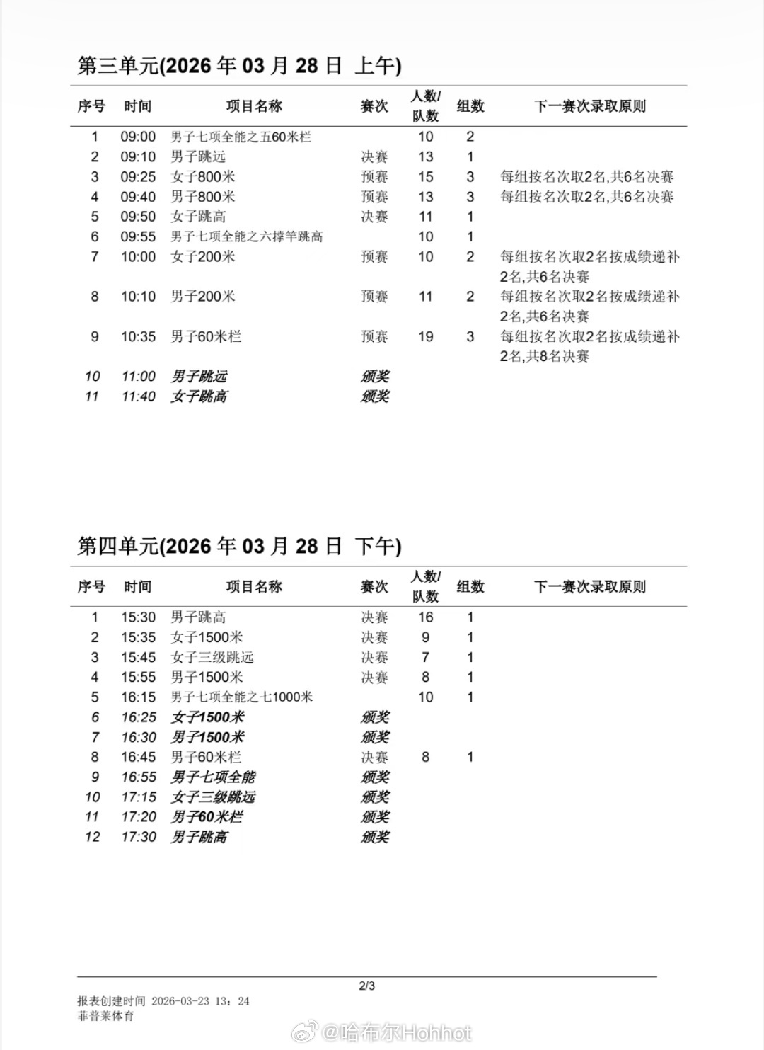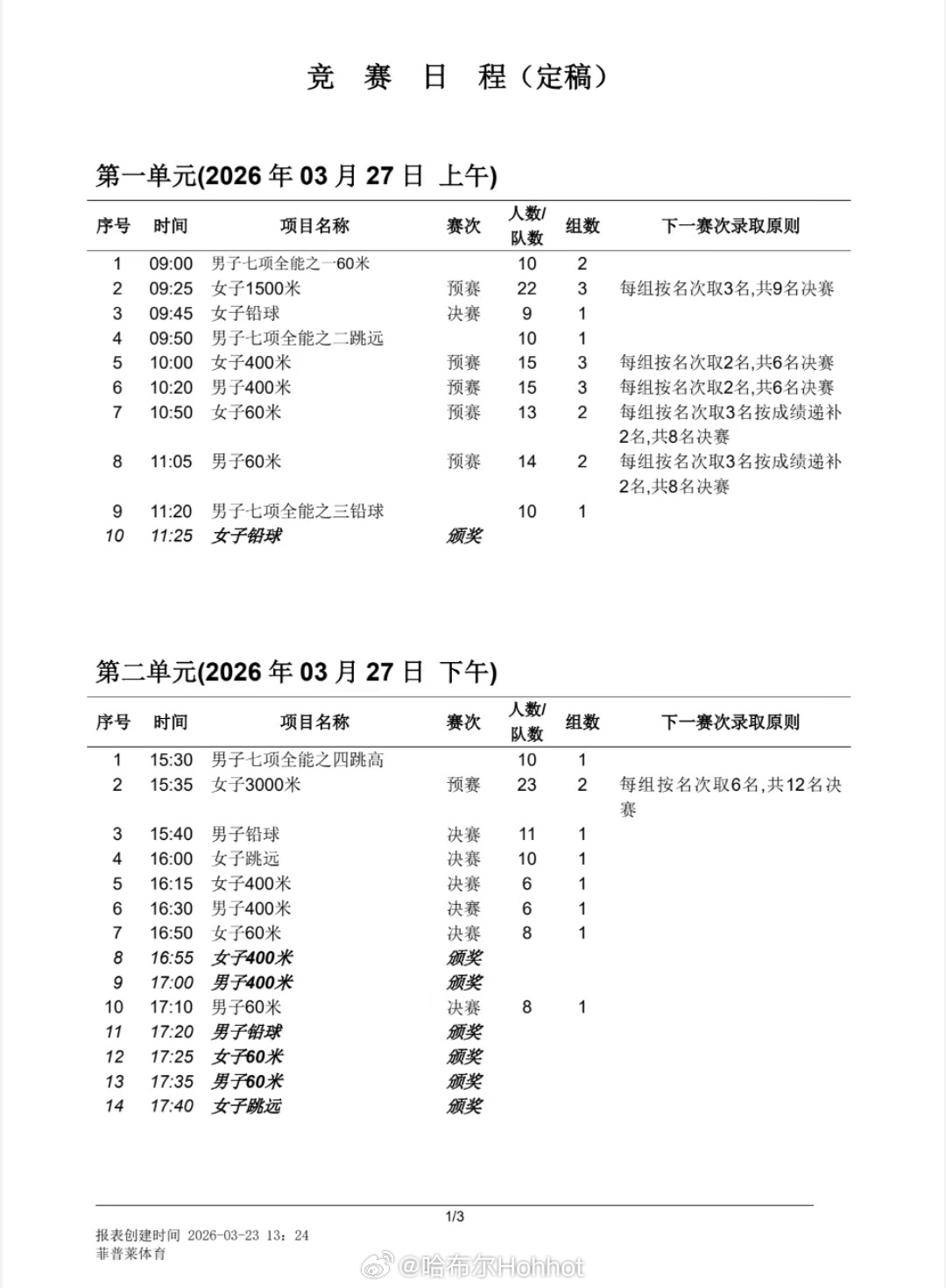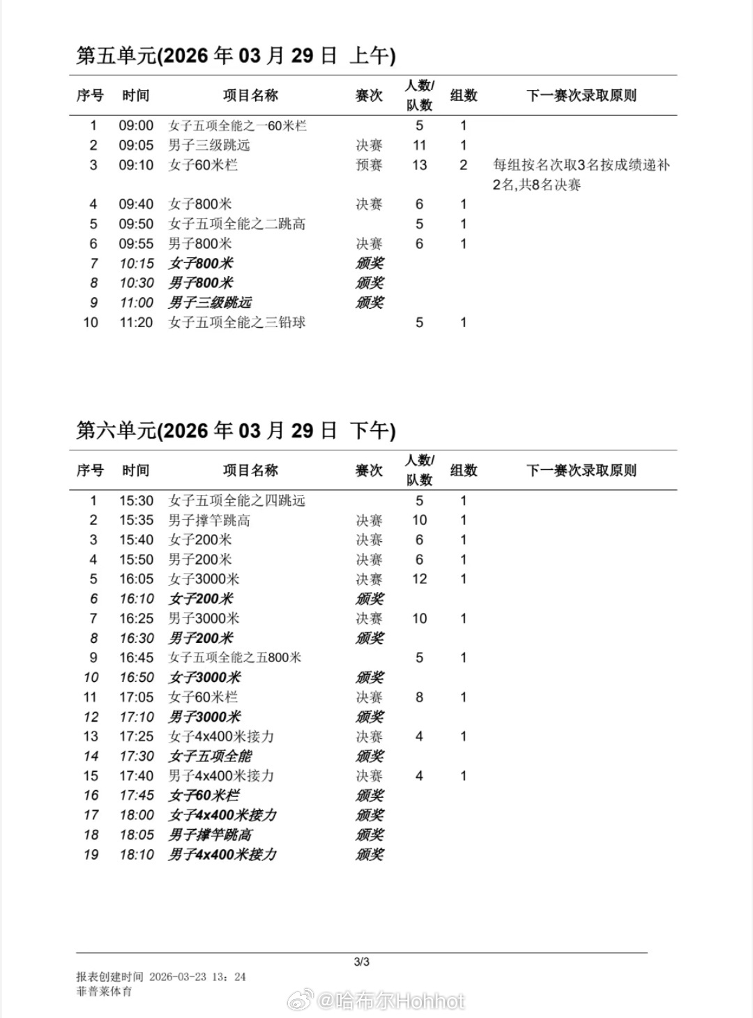 3月27-29日,2026全国室内田径锦标赛在山东省体育训练中心拉开战幕,比赛分为三天6单元,赛程安排如下:成绩查询:网页链接直播:中国田径田径说一哈你不知道的田径故事田径