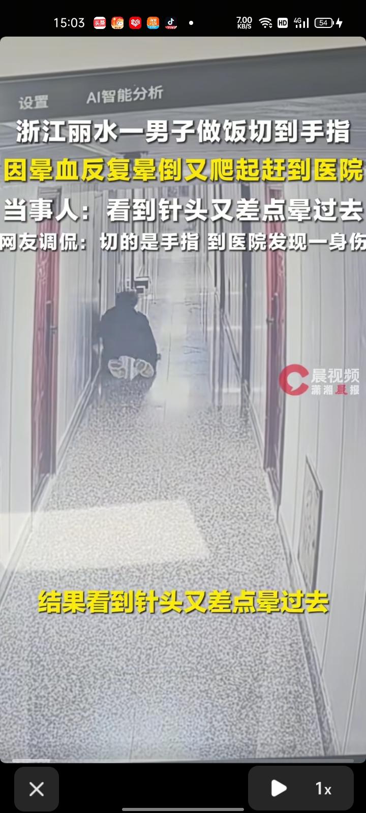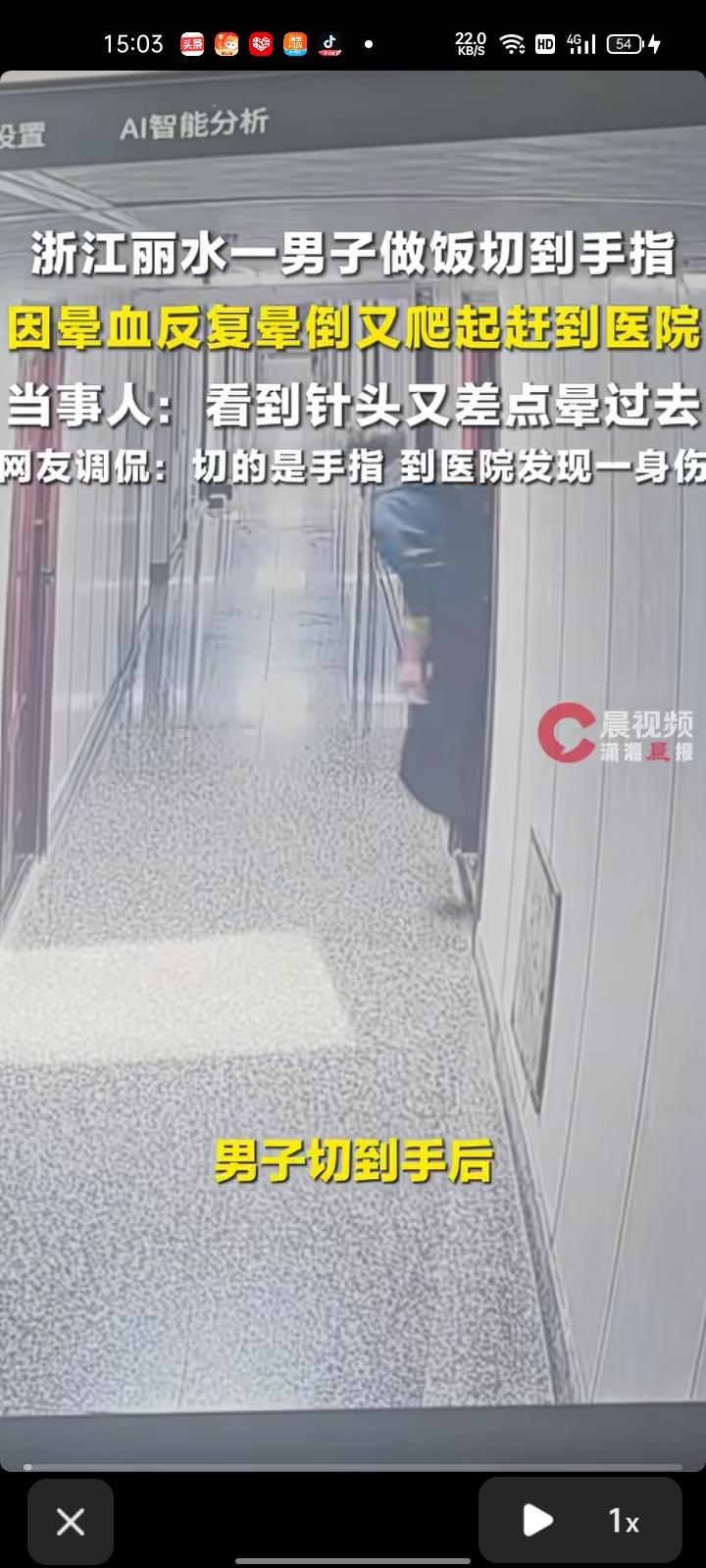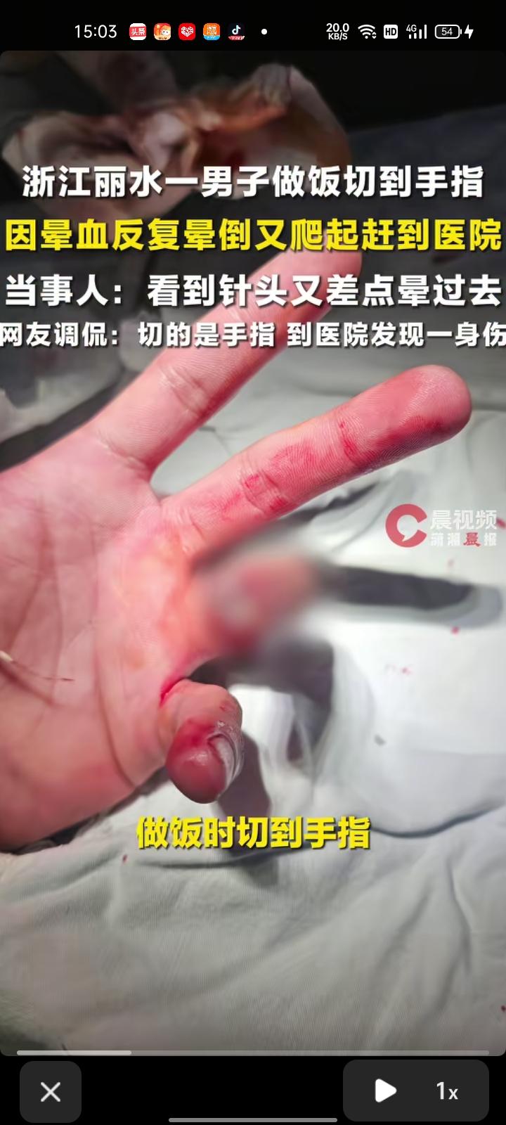 3月24日,浙江丽水。小伙切生姜时不慎切到手指,独自前往医院途中因晕血多次昏倒,仍坚持爬起,最终跌跌撞撞赶到医院。事后回忆,自己不敢在家晕倒,家里只有他自己一人,小狗也帮不了,想着找到人多的地方。 经治疗,目前小伙症状稳定。当事人表示,打完破伤风针又差点晕过去了,跌跌撞撞走到电梯就打车去医院了,看到破伤风的针又晕了 通过这件事我领悟到,最怕的不是受伤,是出事时身边空无一人。其次,切菜的时候要注意一下,不要让菜刀切到手指,可以买个不锈钢护手器。当年我就是被菜刀切到手指过,妈妈的脚后跟被菜刀落下砸到了,不是太严重。