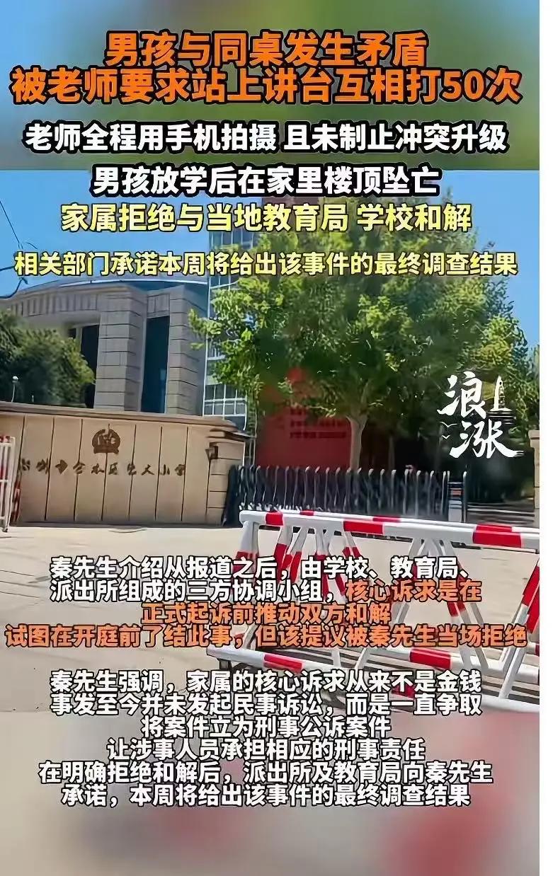 郑州10岁男童被逼讲台互殴50下后跳楼:老师冷眼拍摄,父亲拒赔百万只求刑责,全网怒问师德底线何在! 那个黄昏,天空压得很低,秦先生的世界彻底塌了。他抱着儿子冰冷的书包,怎么也想不明白,早晨还笑着挥手说再见的孩子,为何会在放学后选择从楼顶纵身一跃。直到他颤抖着敲开同学家的门,一段被沉默掩盖的真相才血淋淋地撕开——原来,孩子离开前最后一堂课,竟是一场由老师主导的“尊严处刑”。 仅仅因为课间的小摩擦,两个孩子被班主任叫上讲台。可等待他们的不是调解,而是一句冰冷指令:“不是爱打吗?当着全班面,互打五十下!”空气瞬间凝固,十岁的孩子愣在原地,眼神里满是恐惧。而老师竟举起手机,像观看表演般催促:“用力!不够数不停!” 拳头落在身上的闷响,敲碎了教室的安静。两个被迫“决斗”的孩子,从犹豫到发狠,从羞耻到绝望。同学们屏住呼吸,看着这场荒唐的“公开课”。最终,秦先生的孩子输了,他抹着眼泪走下讲台,衣衫不整,尊严扫地。那一刻,或许死亡已在他心里埋下种子。 放学后,孩子沉默地回家,没哭闹也没抱怨。他独自爬上顶楼,望着灰蒙蒙的城市,跳了下去。一个鲜活的生命,就这样被“五十下耳光”逼入绝境。而事后,涉事老师竟仍站在讲台授课,仿佛一切与她无关。校方匆匆遮掩,试图用“调解”平息风波。 秦先生红着眼冲进教育局,声音嘶哑却斩钉截铁:“我不要赔偿!我要她坐牢!”这位父亲的呐喊,撕开了多少教育悲剧的遮羞布?若暴力能被美化成“教育”,若冷漠披上“严师”外衣,我们还能放心把孩子交给谁? 更令人心寒的是,事件曝光后,学校、教育局、派出所组成“协调小组”,核心目的竟是推动和解。他们试图用金钱抹平一条生命的重量,却低估了一个父亲的决心。秦先生反复强调:“我只求刑事责任,不要一分钱!”这不仅是控诉,更是对正义底线的死守。 如今,相关部门承诺本周给出调查结果。全网都在等待一个答案:那个举起手机、冷眼旁观孩子互殴的老师,究竟会迎来什么结局?若她仍能安然执教,我们将如何面对千万个校园里脆弱的心灵? 教育本是点亮灵魂的灯塔,何时成了碾压尊严的刑场?当孩子拳头挥向同桌时,挥不去的其实是成人世界种下的恶。我们呼吁严惩,不止为这一个孩子,更为让所有教师铭记:你手握戒尺,但尺下应是未来,而非坟墓。 (来源:根据热度新闻、当事人采访及多方媒体报道综合整理) 校园悲剧 师德问责
