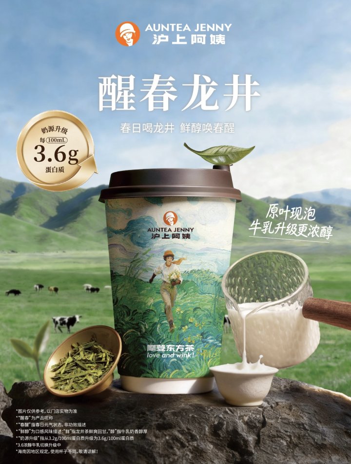 为了优化口感,品牌今年对配方进行了全面升级,相较2025年的龙井产品,今年龙井原料用量增加约4%,同时延长3分钟茶汤泡制时间,让龙井的豆香与鲜爽更突出;奶源升级为3.6g/100ml蛋白质的优质牛乳,奶韵更浓醇,茶味与奶味平衡得恰到好处。其中醒春龙井主打纯茶与牛乳的融合,清爽不腻;龙井糯青团则加入了Q弹的青团小料,口感更丰富,精准戳中年轻人的喜好。