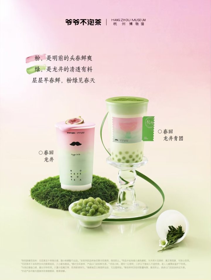 今年春茶季,爷爷不泡茶的龙井新品,大概是最懂杭州本土情怀的一款。3月20日,品牌携手杭州博物馆,以馆藏元代影青釉里红高足瓷杯(网红“腮红杯”)为灵感,全国上线春回龙井鲜系列,推出春回龙井、春回龙井青团两款新品,把杭州的文物底蕴与春日茶香完美融合。