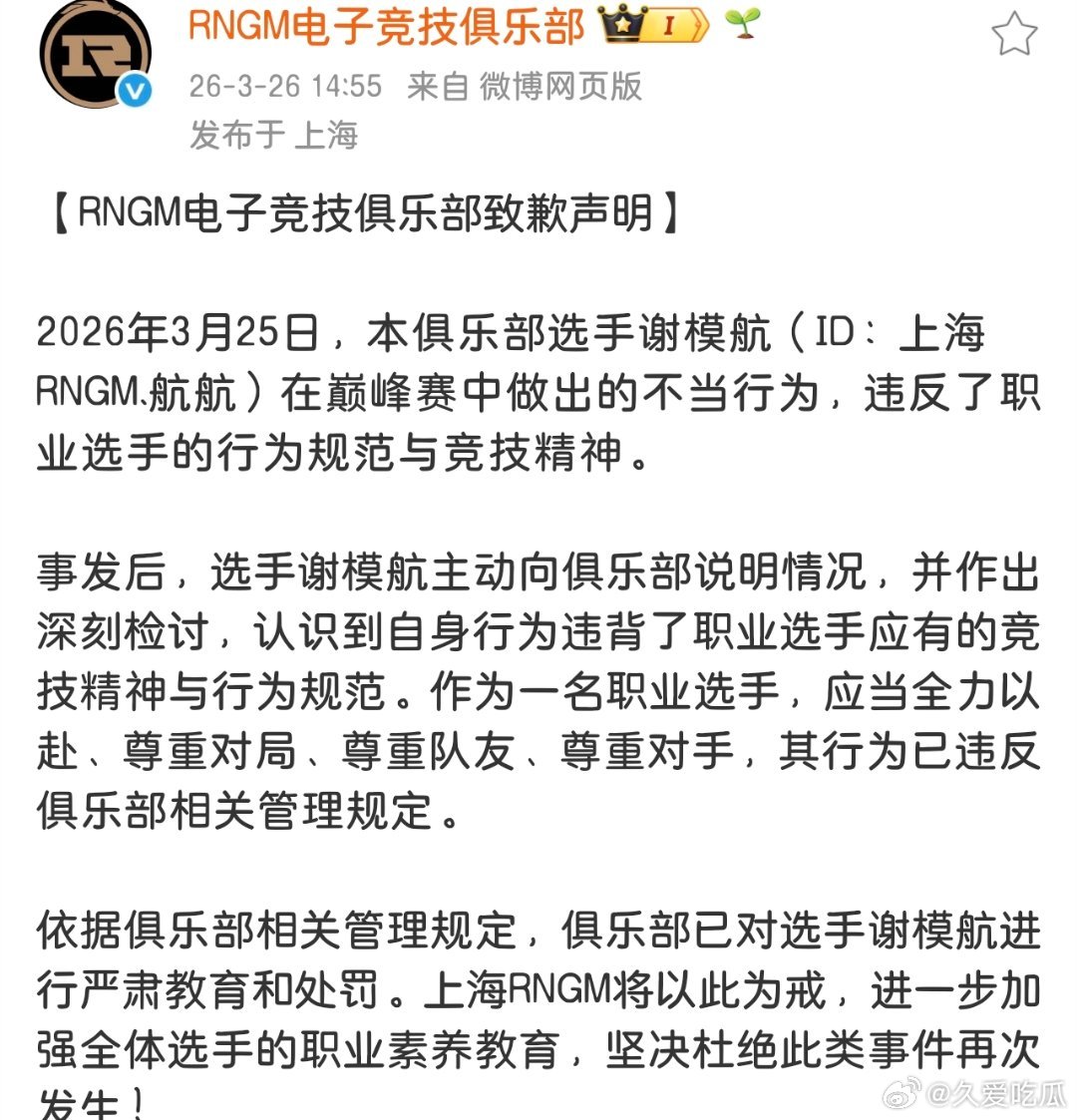 针对航航在巅峰赛中做出的不当行为, RNGM发表致歉声明