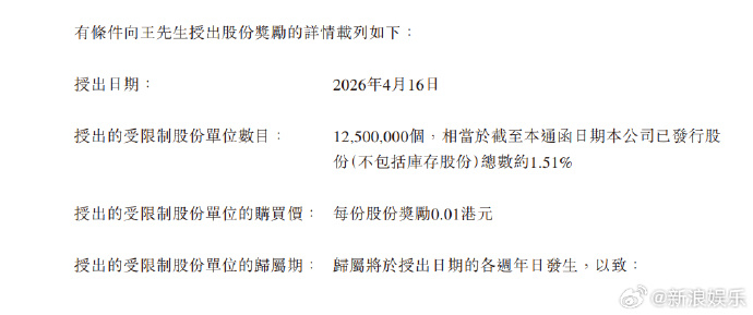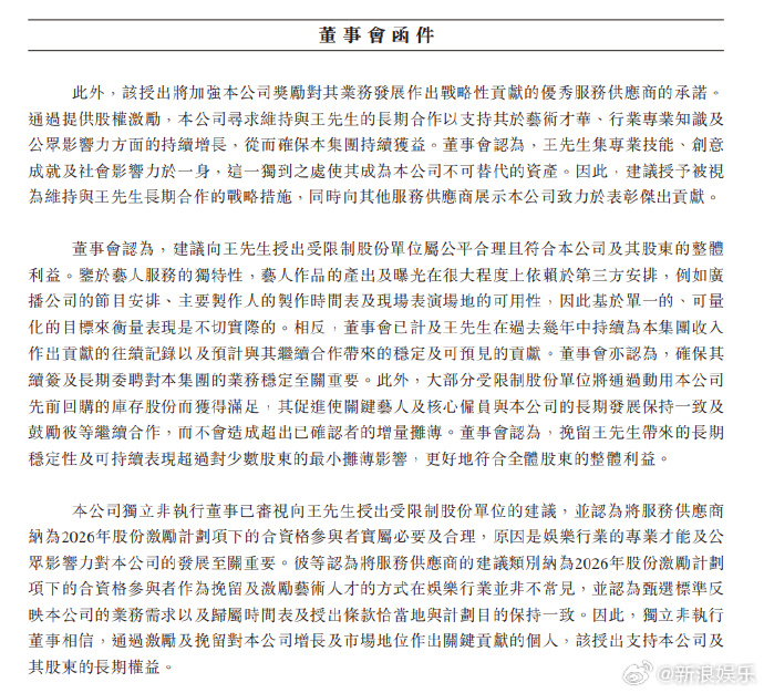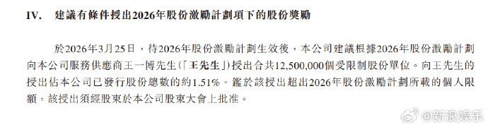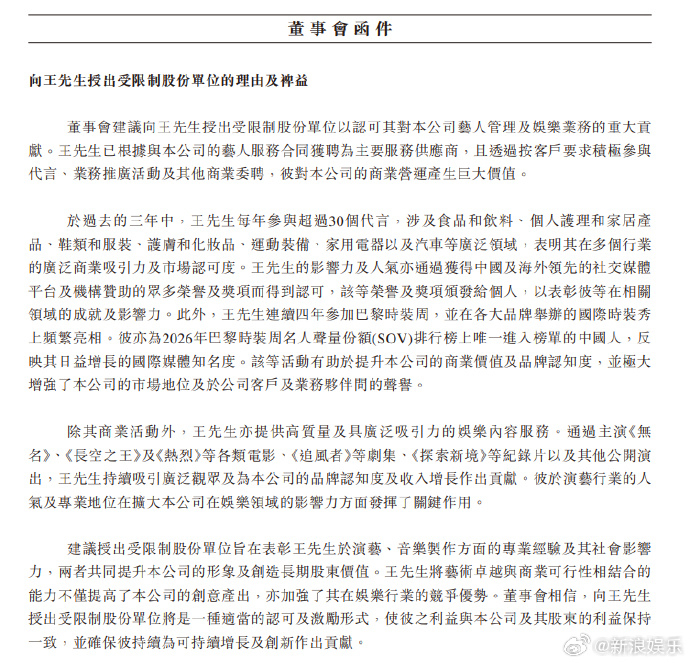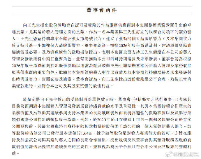 乐华娱乐寻求与王一博的长期合作乐华建议向王一博授出股份奖励 据乐华娱乐25日公开的董事会函件,公司建议有条件向授出股份奖励:旨在认可及奖励其对集团业务做出的卓越贡献,寻求维持与王一博的长期合作。董事会认为,挽留王一博带来的长期稳定性及可持续表现超过对少数股东的最小摊薄影响,更好符合全体股东的整体利益。