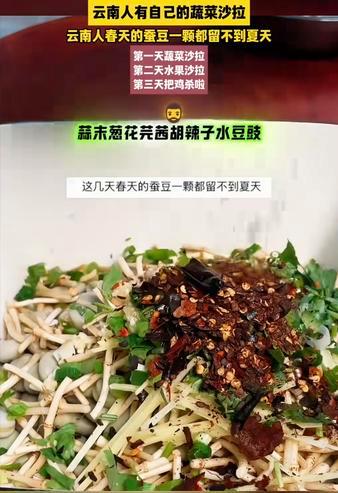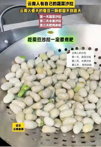有人说云南人有自己的蔬菜沙拉! 原来春天的蚕豆还能这样拌了吃,又学到一个新的菜!凉拌蚕豆折耳根! 我还挺喜欢吃蚕豆的,就是在城里买来的蚕豆,感觉没有老家的好吃,味道有些淡,不够甜。好想回去吃蚕豆豌豆。