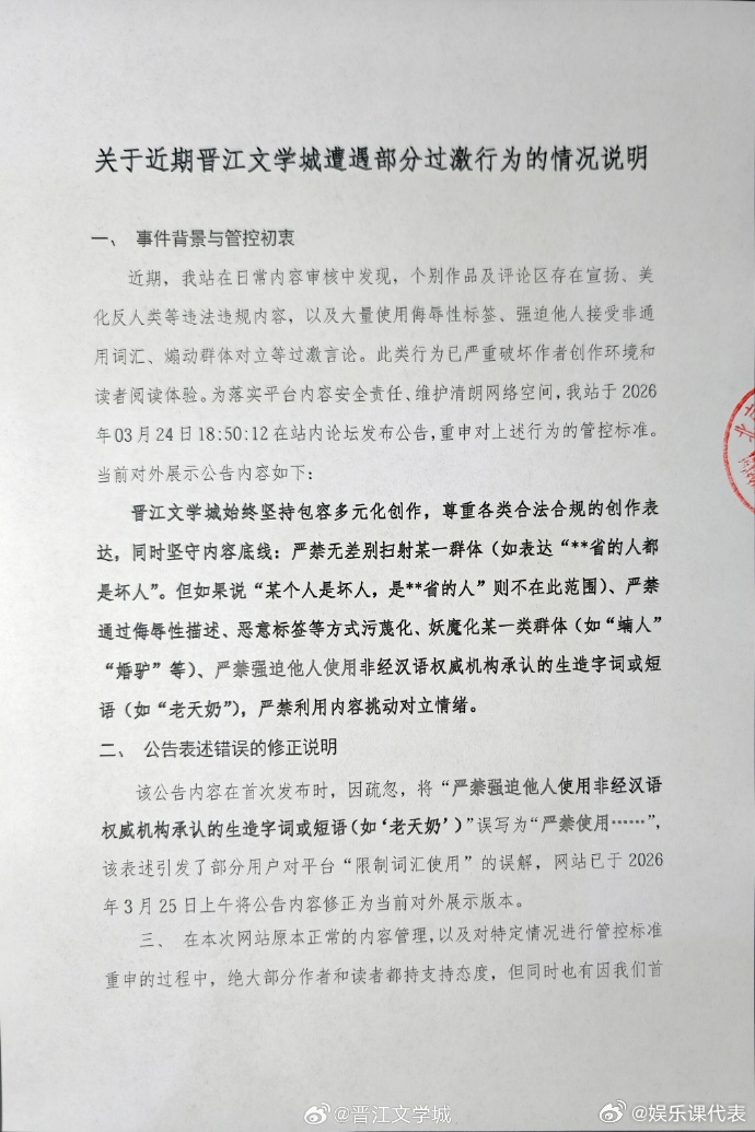晋江回应严禁使用老天奶 晋江发情况声明回应禁止使用“老天奶”词汇。