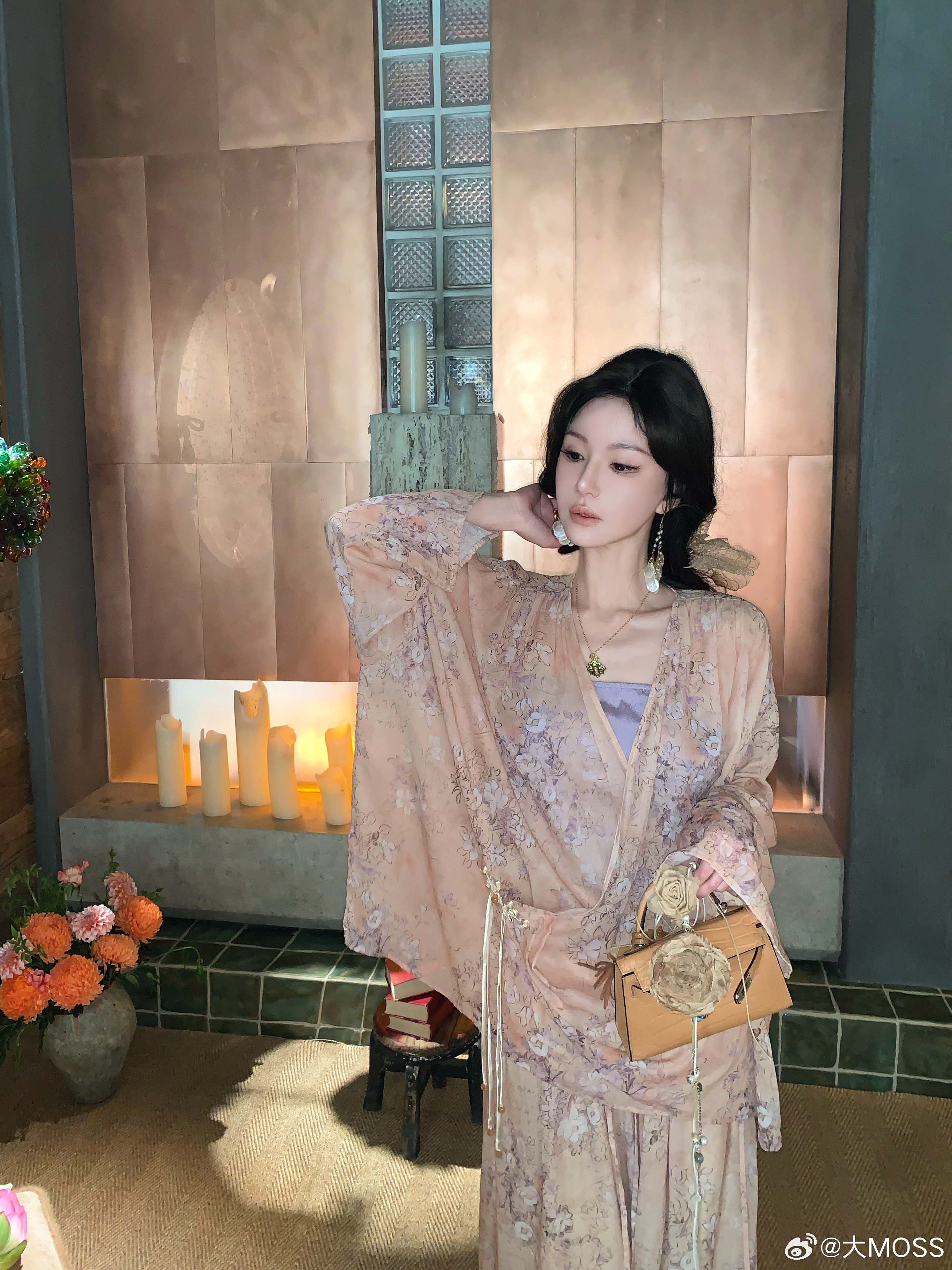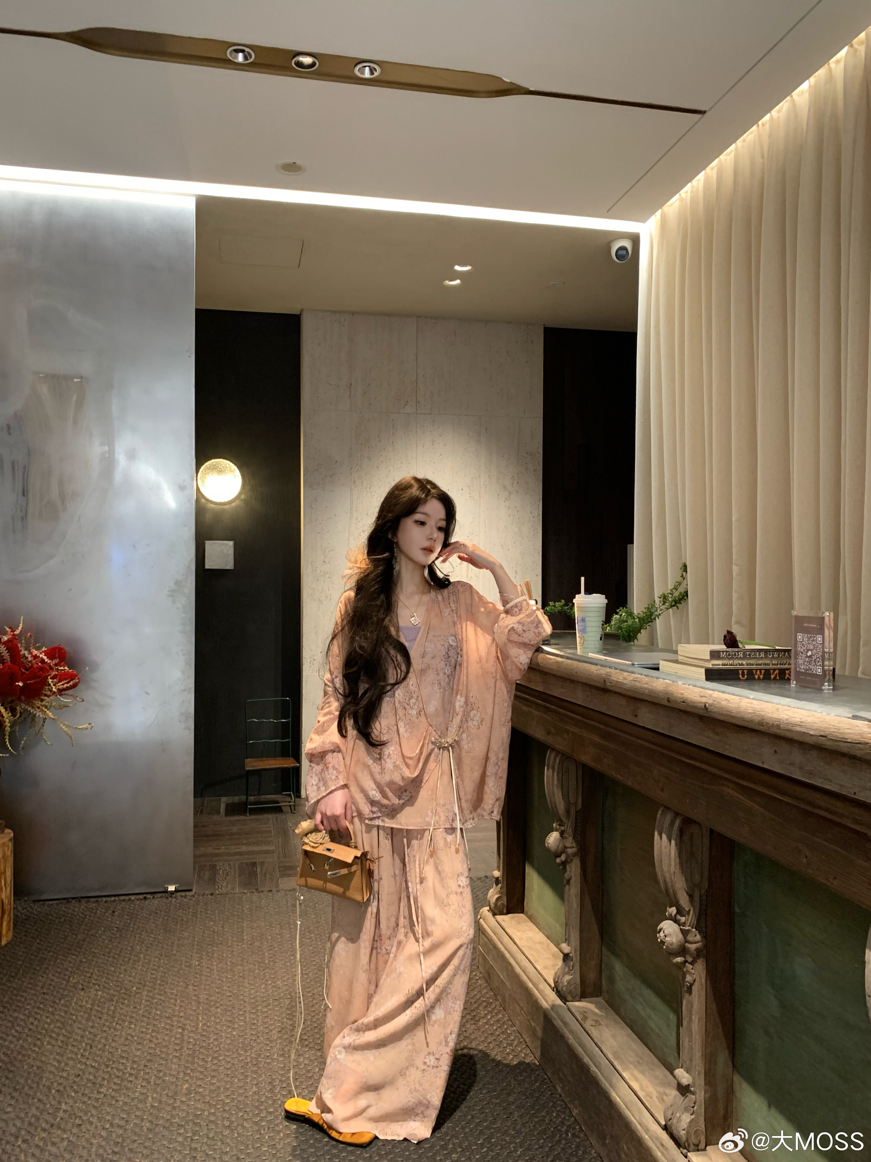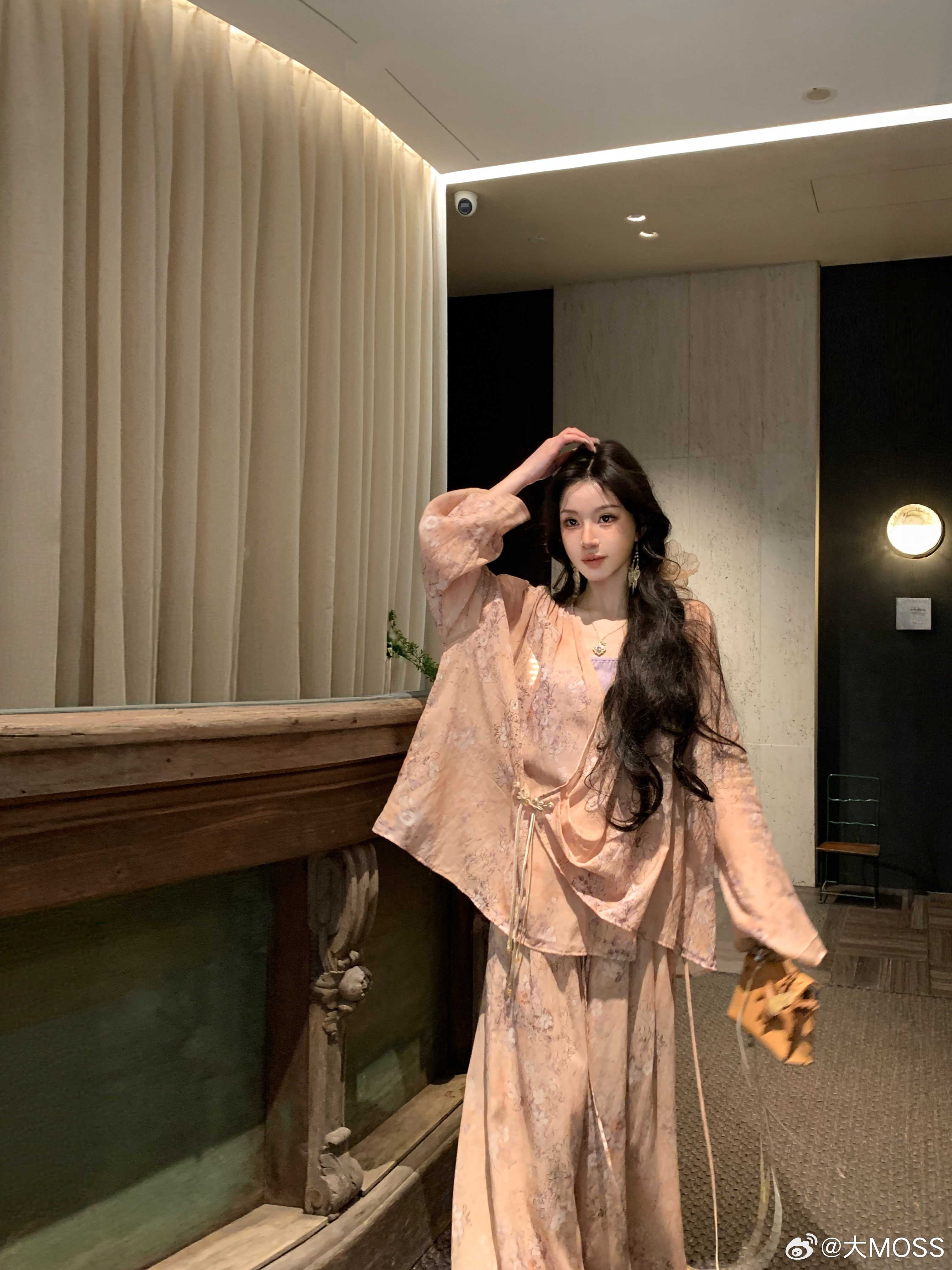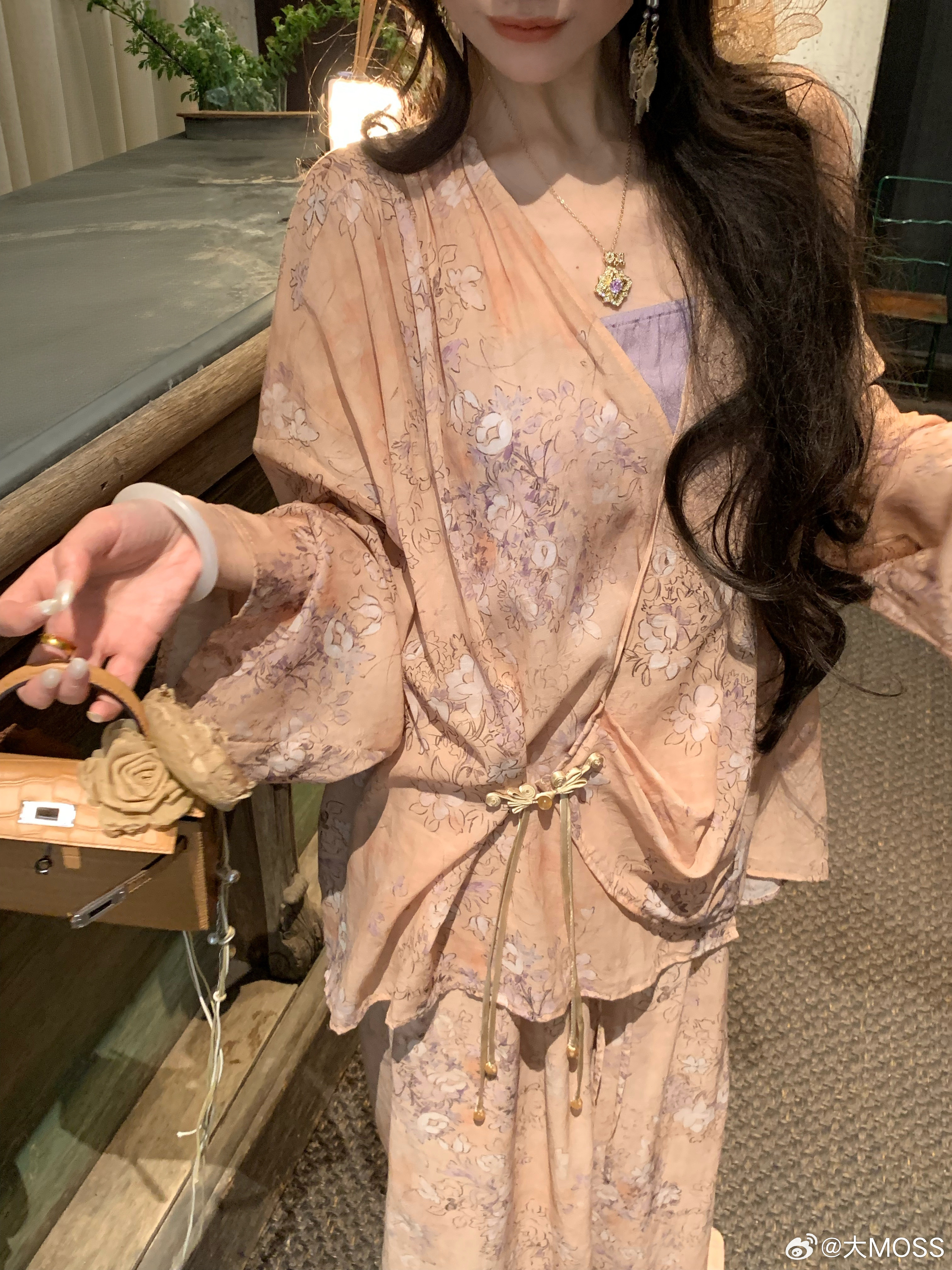 𝑴𝑶𝑺𝑺 𝟑.𝟑𝟎/𝟐𝟎:𝟎𝟎𝒑𝒎【水墨笙花】🪻🪷新中式铜氨花卉V领上衣+裤子上衣交叉 V 领罩衫以柔和的浅橘色为底色,晕染着淡紫调的朦胧碎花,自带春日氛围感。交叉围裹式门襟结合微垂褶裥,巧妙修饰腰腹线条,视觉上更显轻盈松弛。阔腿裤采用松紧腰头设计,对腰腹线条有包容度,能轻松优化身材比例👍