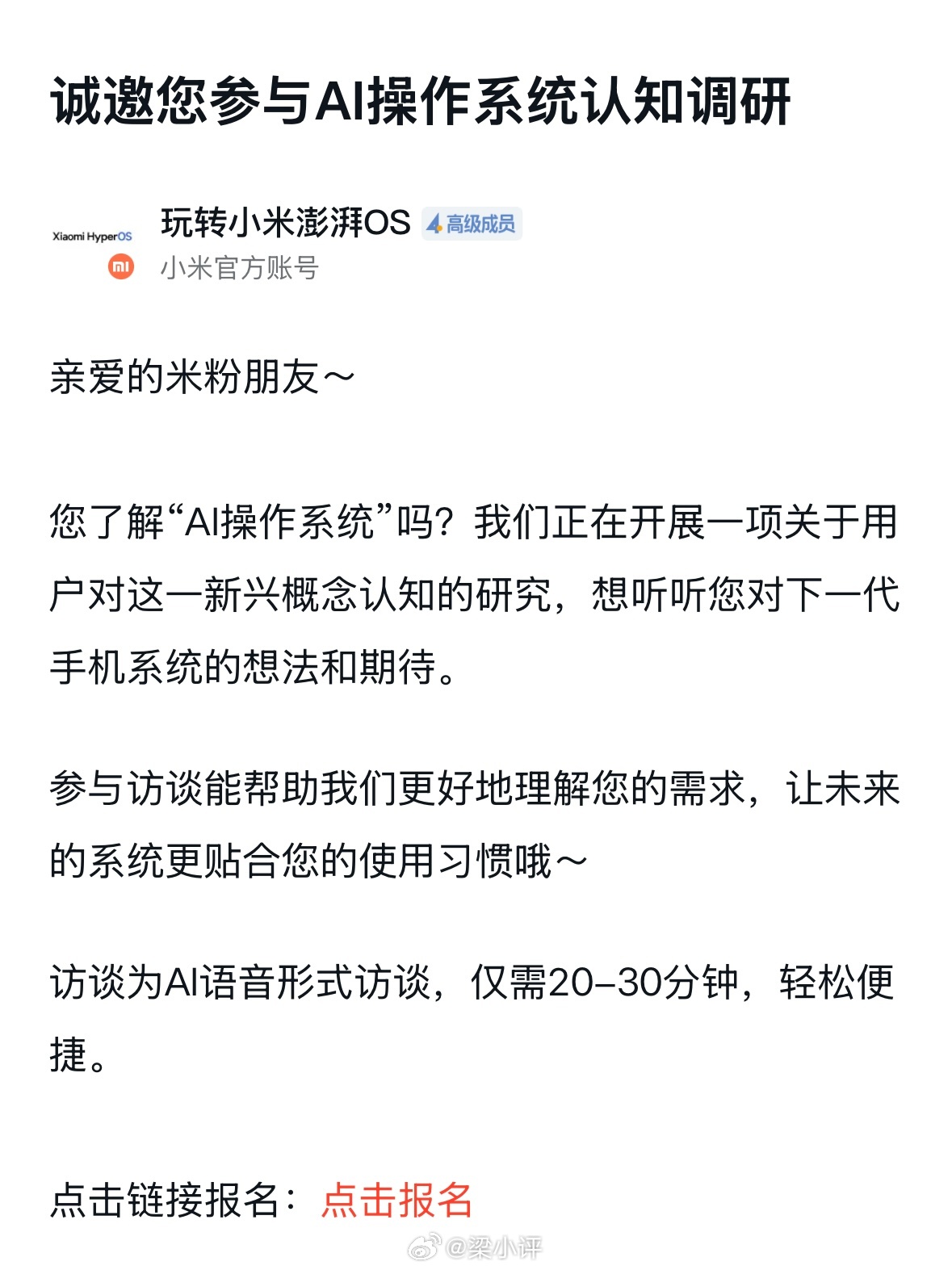 小米MIUI停更从澎湃OS发布后,MIUI就走进了历史,从小米1的MIUI到小米17的澎湃OS,十几年了,小米成长为世界500强,这都离不开米粉的支持!而澎湃OS是人车家战略的重要支撑之一,小米澎湃OS3也收获大量用户好评,功能也更丰富了,小米超级岛,和苹果互联等都有了,越来越好用了!另外,小米调研AI操作系统,或许小米AIOS已经在路上了?