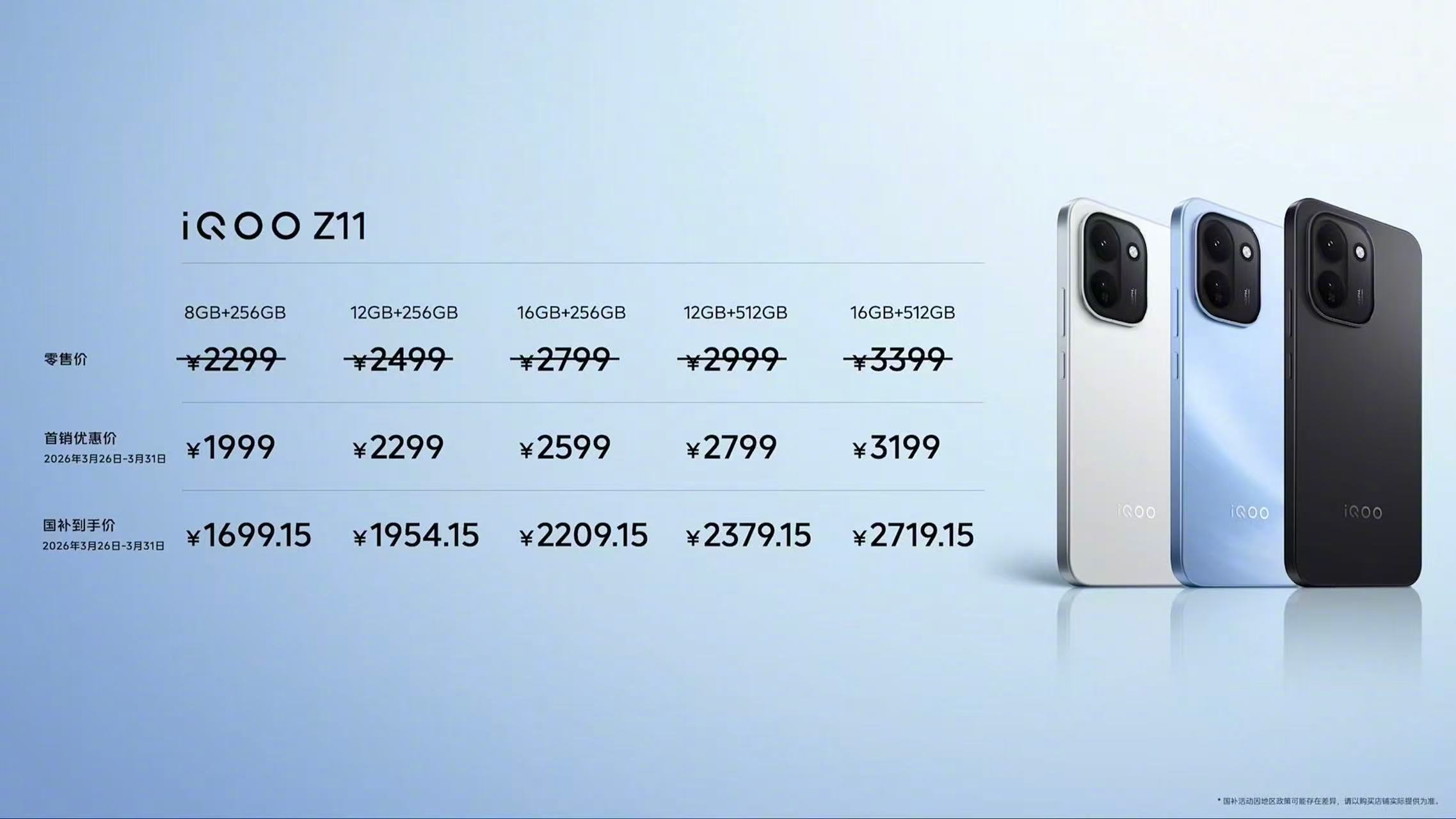 价格信息如下:iQOO Z11 8GB+256GB 1999元,国补到手价1699.15元iQOO Z11 12GB+256GB 2299元,国补到手价1954.15元iQOO Z11 16GB+256GB 2599元,国补到手价2209.15元iQOO Z11 12GB+512GB 2999元,国补到手价2379.15元iQOO Z11 16GB+512GB 3399元,国补到手价2719.15元