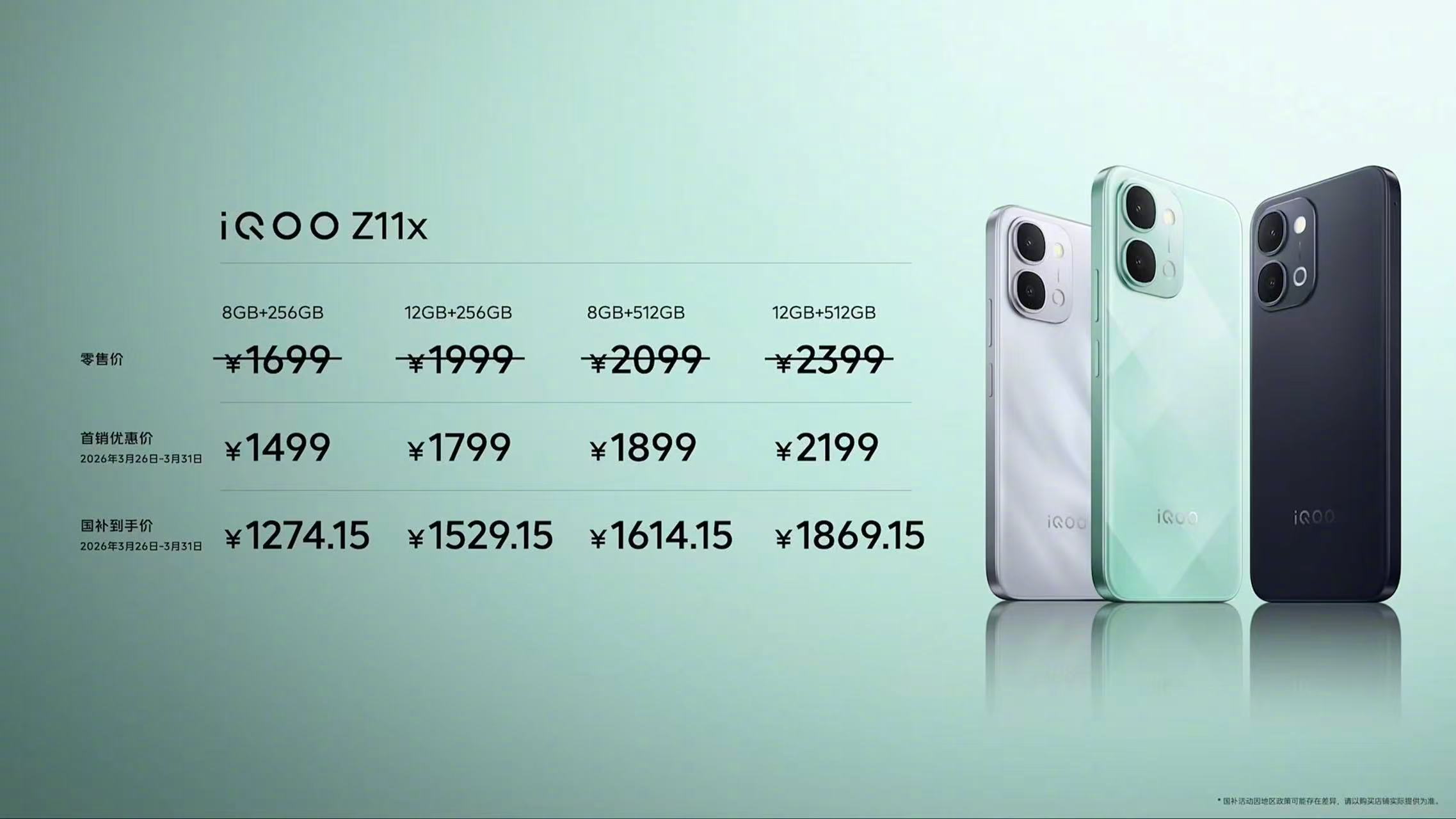 iQOO Z11x 8GB+256GB 1499元,国补到手价1274.15元iQOO Z11x 12GB+256GB 1799元,国补到手价1529.15元iQOO Z11x 8GB+512GB 1899元,国补到手价1614.15元iQOO Z11x 12GB+512GB 元,国补到手价1869.15元iQOO Z11