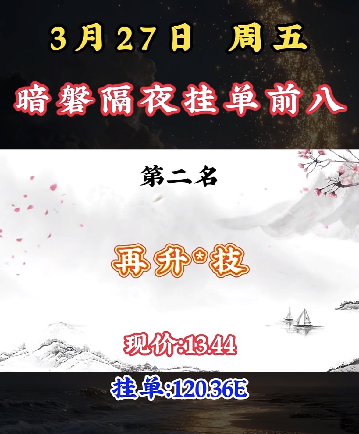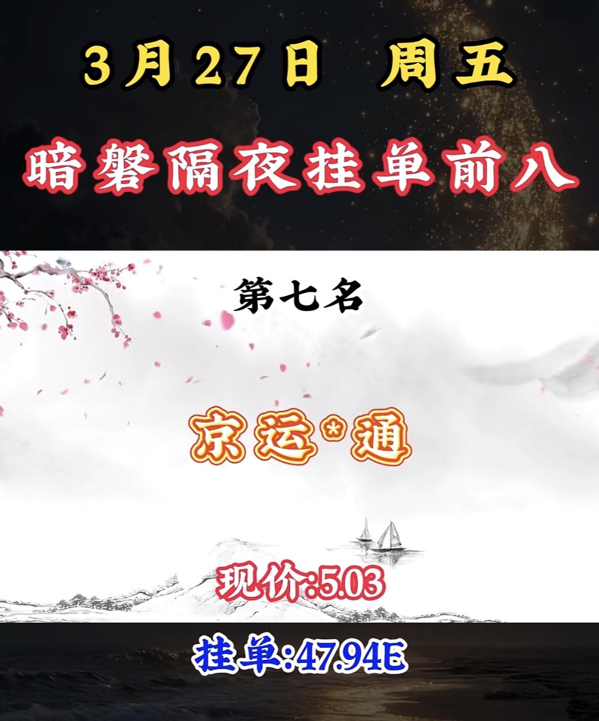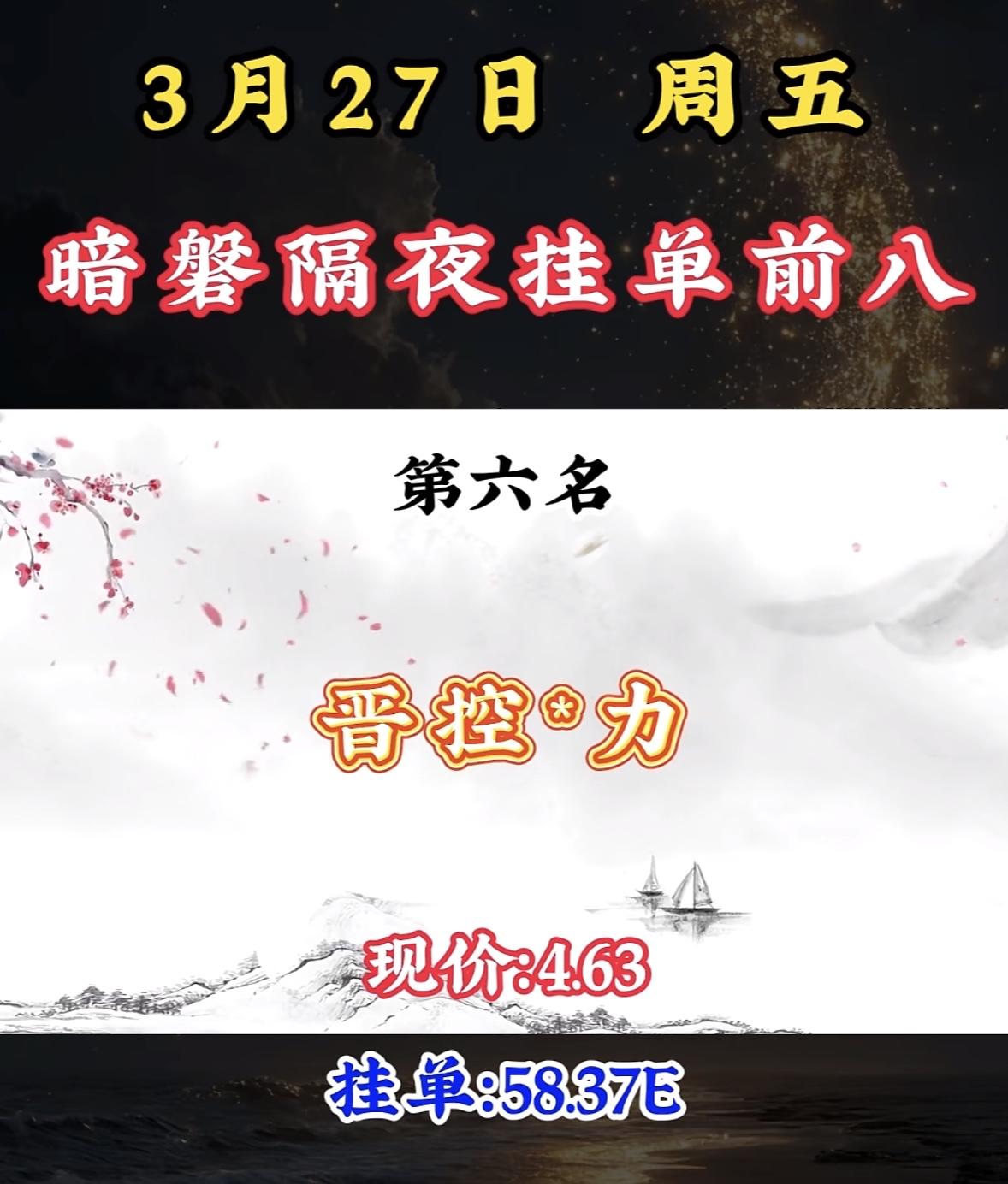 3月27日周五暗盘隔夜挂单排行榜揭晓 3月27日周五,暗盘前八里西部材料价格到了46.74,我挂单43.65,就等着看能不能成交。这股票市场就像一场刺激的冒险,谁也不知道下一秒会怎样。就拿金牛化工和敦煌种业来说,3月9日金牛化工下跌,营业部席位净卖出;而3月6日敦煌种业涨停,营业部席位净买入。不同的走势,背后是各种资金的博弈。我这挂着西部材料的单,心里也七上八下的,说不定能低价买入赚一笔,也可能就这么错过了。股票这东西,真让人又爱又恨。