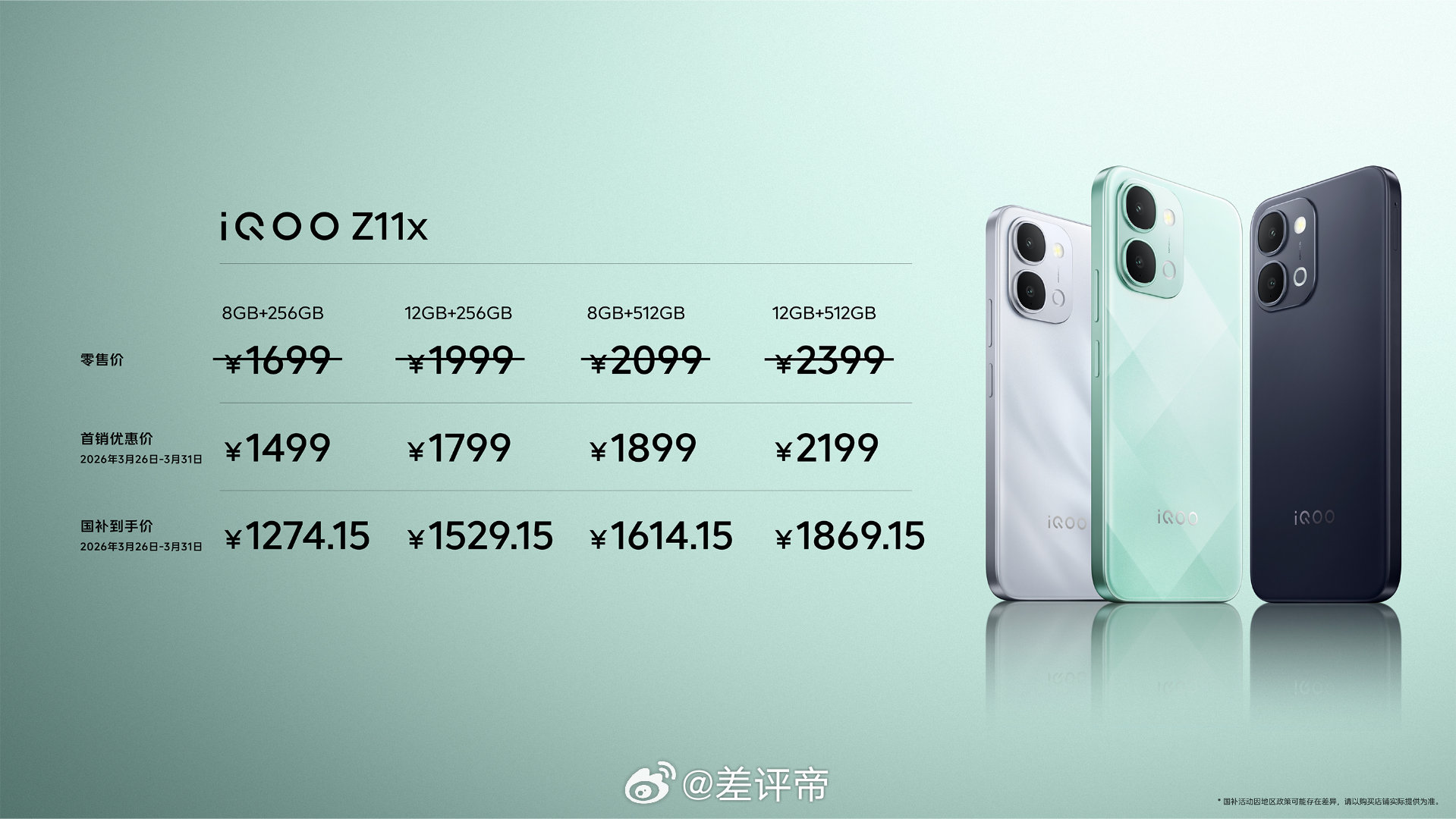 iQOO Z11x8GB+256GB版本,零售价1699元,首销优惠价1499元,国补到手价1274.15元;12GB+256GB版本,零售价1999元,首销优惠价1799元,国补到手价1529.15元;8GB+512GB版本,零售价2099元,首销优惠价1899元,国补到手价1614.15元;12GB+512GB版本,零售价2399元,首销优惠价2199元,国补到手价1869.15元。iQOO Z118GB+256GB版本,零售价2299元,首销优惠价1999元,国补到手价1699.15元;12GB+256GB版本,零售价2499元,首销优惠价2299元,国补到手价1954.15元;16GB+256GB版本,零售价2799元,首销优惠价2599元,国补到手价2209.15元;12GB+512GB版本,零售价2999元,首销优惠价2799元,国补到手价2379.15元;16GB+512GB版本,零售价3399元,首销优惠价3199元,国补到手价2719.15元。大家觉得这个价格怎么样?两个手机都很有特色我简单说两句iQOO Z11是2K档罕见的续航+高刷全能卷王,核心卖点:搭载iQOO首款165Hz 1.5K OLED电竞直屏,2000Hz触控采样拉满游戏操控体验;配备品牌史上最大的9020mAh第二代半固态蓝海电池+90W快充,哪怕低温环境也能稳住超长续航,彻底告别电量焦虑;天玑8500满血版处理器安兔兔跑分超262万,搭配IP68防尘防水、NFC、红外等全功能外围配置iQOO Z11x则是千元档的耐用续航标杆,精准命中了LCD党、长辈用户、户外工作者的核心需求。核心卖点清晰明确:7200mAh超大蓝海电池,能实现两三天一充的超长续航表现;120Hz LCD莱茵护眼屏支持DC调光,是频闪敏感用户的福音;天玑7400处理器可流畅覆盖日常社交、影音、轻度游戏全场景,国补后不到1300还是挺有诚意的价格。科技数码