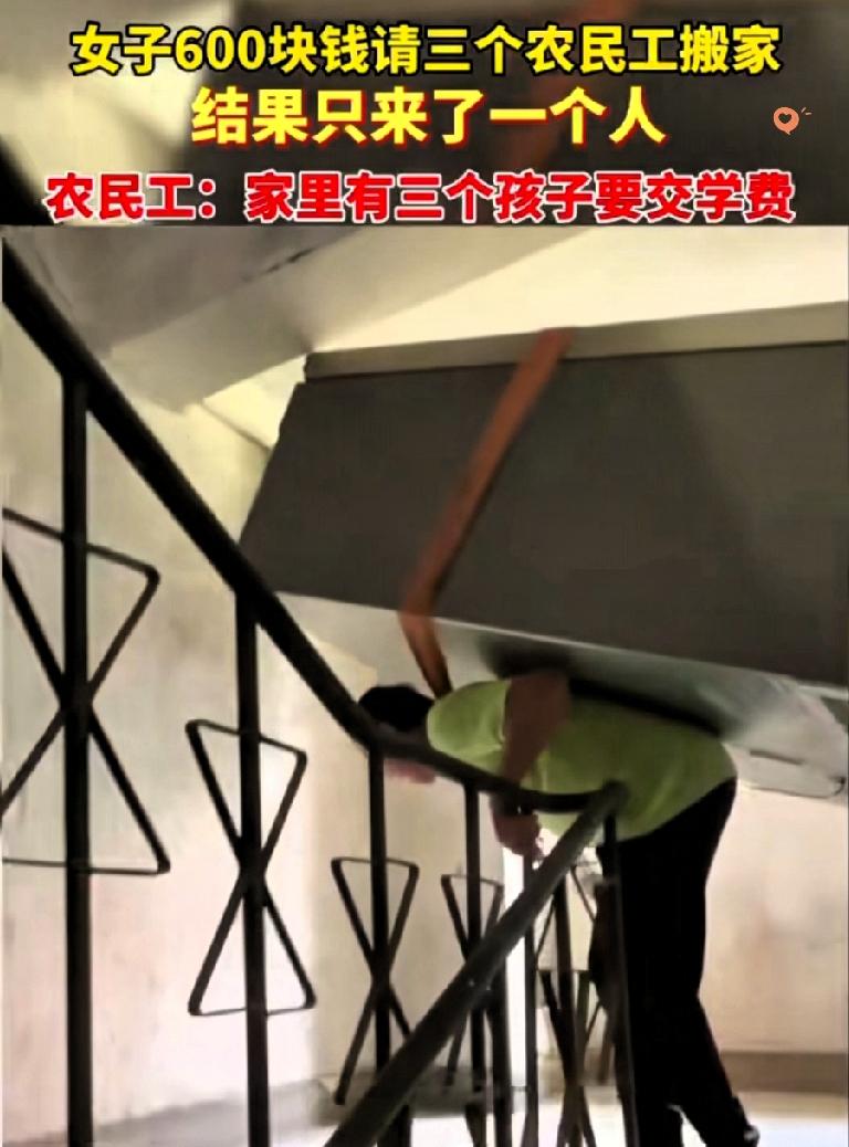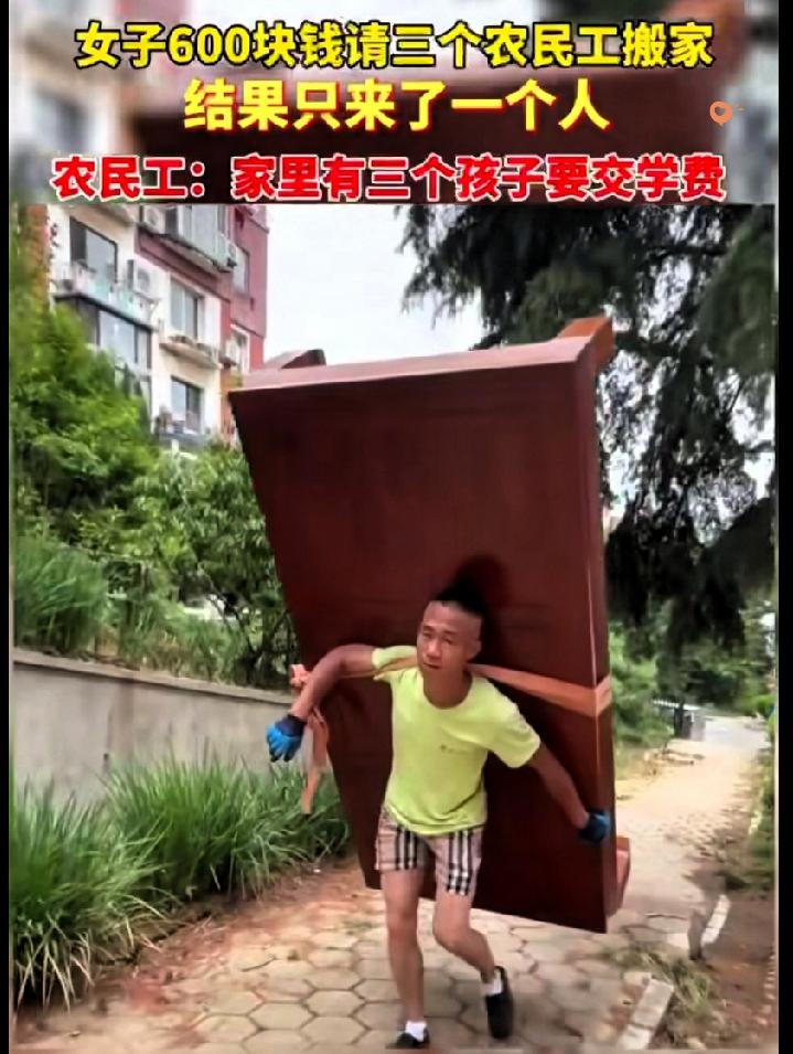 大连女子花600元雇3人搬家,结果只来一位农民工大叔,刚想发火,大叔一句话让她瞬间红了眼:“求你给次机会,3个孩子等着交学费!” 谁能想到,这位朴实的大叔仅凭一条布带,硬生生一个人扛下了三个人的活。 从清晨到日暮,冰箱、衣柜这些重物被他稳稳扛上楼梯,汗水浸透衣衫结出白碱,却连口水都舍不得多喝,更没提过一句加钱。 这哪是单纯的搬家? 分明是一位父亲用肩膀扛起的责任。 他没有光鲜的工作,却用最实在的力气诠释着父爱,不偷懒、不抱怨,把每一份信任都当成救命的稻草。 而女子主动加钱的举动,更是让善意双向奔赴,这才是人与人之间最该有的温度。 生活里的感动从不是轰轰烈烈,而是困境中彼此的体谅。你遇到过这样暖心的陌生人吗?评论区聊聊~