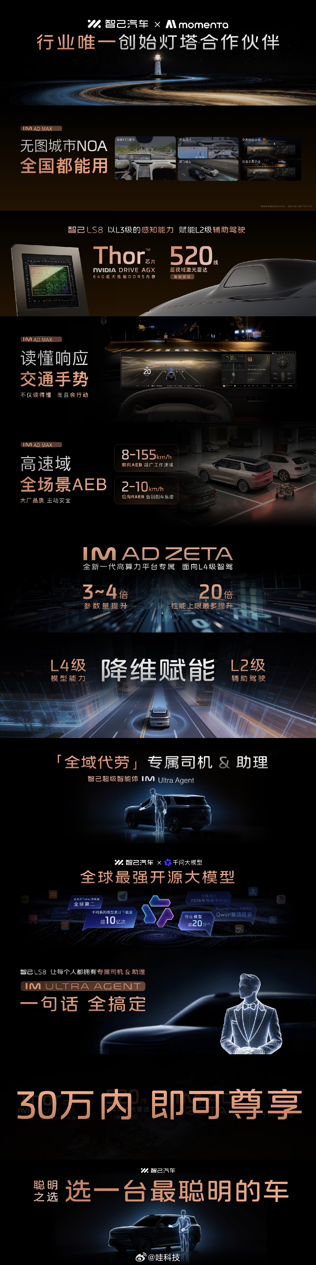 智己LS8定位很清晰,30万内把家用旗舰该做的点全拉满了。全系标配灵蜥数字底盘3.0,双向24°四轮转向让5米大车转弯半径仅4.85米,地库、窄路一把过,空悬与舒适制动兼顾操控与乘坐舒适,家人不易晕车。恒星增程综合续航1605公里,纯电430公里满足一周通勤,800V快充12分钟高效补能,加92号汽油无压力。IM AD智驾搭载雷神芯片与激光雷达,千问大模型上车交互更自然。超宽体座舱空间宽裕,B&O音响、4D按摩座椅、智控地暖配置贴心,五座六座灵活切换。航盾电池与潜艇笼式车身严守安全底线,对注重舒适、智能与安全的品质家庭来说,是很实在的聪明之选。
