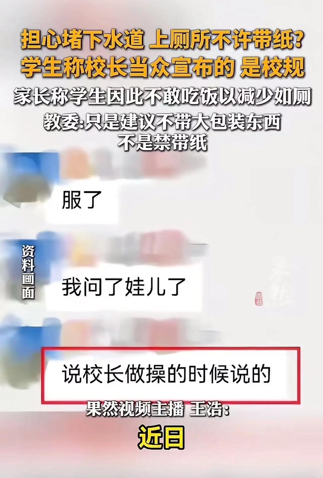 重庆一所小学出了一个神规定,校长宣布上厕所“不能带纸”!网友:这类人怎么当上校长的呢? 荒诞“禁纸令”:教育管理岂能如此儿戏 近日,重庆一所小学出台的“神规定”在网络上引发轩然大波——校长宣布学生上厕所“不能带纸”!消息一出,网友们瞬间炸开了锅,纷纷质疑:“这类人怎么当上校长的呢?” 想象一下这样的场景:孩子刚进门,书包还没放下,就捂着肚子喊饿,这生理需求急切又真实。而当他们内急冲向厕所,却发现自己没带纸,那该是怎样的窘迫与无助?对于年幼的孩子来说,这可能会让他们陷入极大的恐慌之中,甚至可能因为害怕而憋着不敢上厕所,长此以往,对孩子的身体健康会造成严重的损害。 从教育的角度来看,学校本应是培养孩子良好习惯和品德的地方,但这样的规定却完全背离了教育的初衷。教育不仅仅是知识的传授,更是对孩子的关爱与呵护。连上厕所带纸这样基本的生理需求保障都做不到,还谈何关爱学生?这无疑会在孩子心中留下阴影,让他们觉得学校是一个冷漠、不近人情的地方,不利于孩子身心的健康成长。 再从管理的层面分析,出台这样的规定,校长的管理思维实在是令人匪夷所思。这或许是一种简单粗暴的管理方式,试图通过禁止带纸来减少厕所的卫生问题,但却没有考虑到实际的可操作性和对学生造成的影响。一个好的管理者,应该是在保障学生基本权益的前提下,通过合理的方式来解决管理中的问题,而不是采取这种因噎废食的做法。 教育是一项神圣而严肃的事业,容不得半点马虎和随意。校长作为学校的领导者,肩负着重要的责任和使命,其决策应该深思熟虑、科学合理。希望这所小学的校长能够认识到自己规定的荒谬之处,及时撤销这一“禁纸令”,重新审视自己的管理理念和方法,真正做到以学生为中心,为孩子们创造一个温馨、和谐、健康的学习环境。否则,这样的“神规定”只会成为教育界的笑柄,损害学校的声誉和形象。 重庆一所小学出了一个神规定 上厕所不能带纸