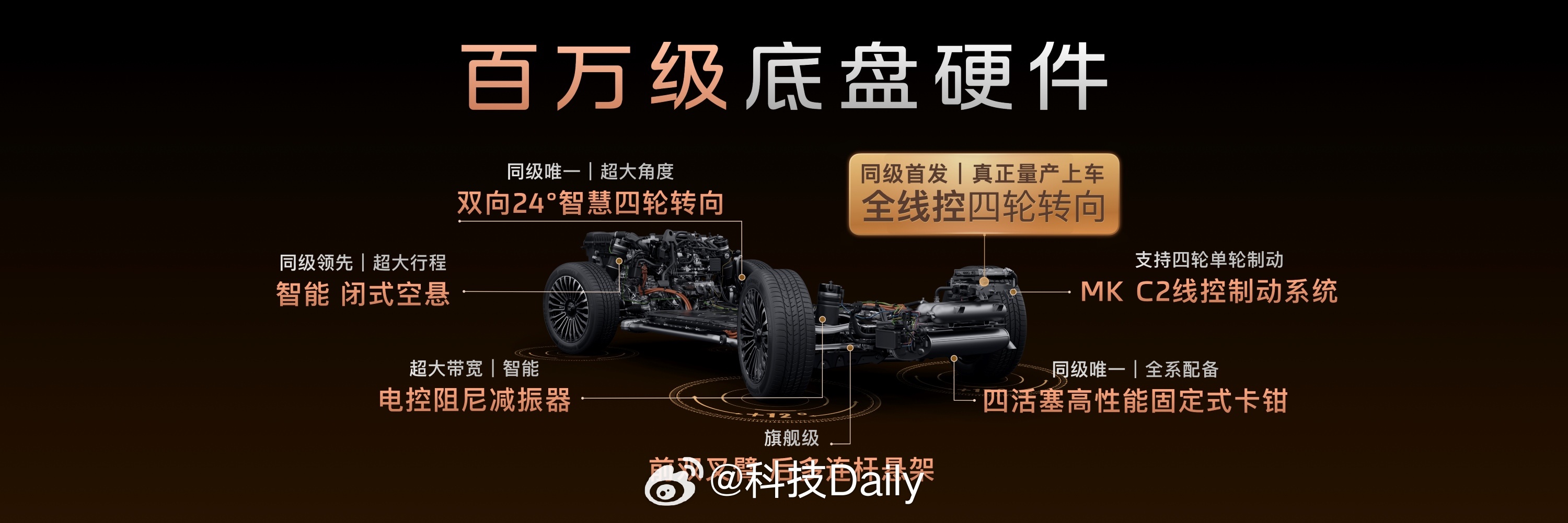 双向24°智慧后轮转向系统,驾驶更轻松,全线控四轮转向,好开更好坐,低速半圈打满即可一把掉头,开得省心更省事,真正做到了指哪儿开哪儿,享受顺心的体验。