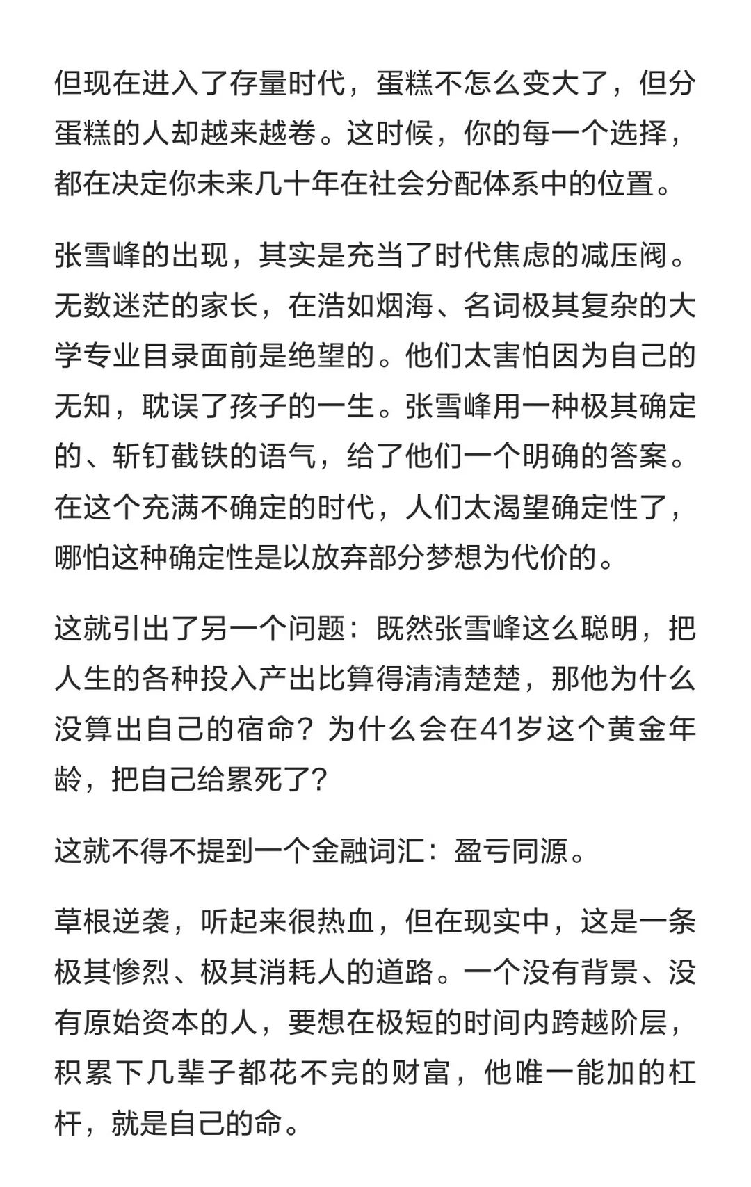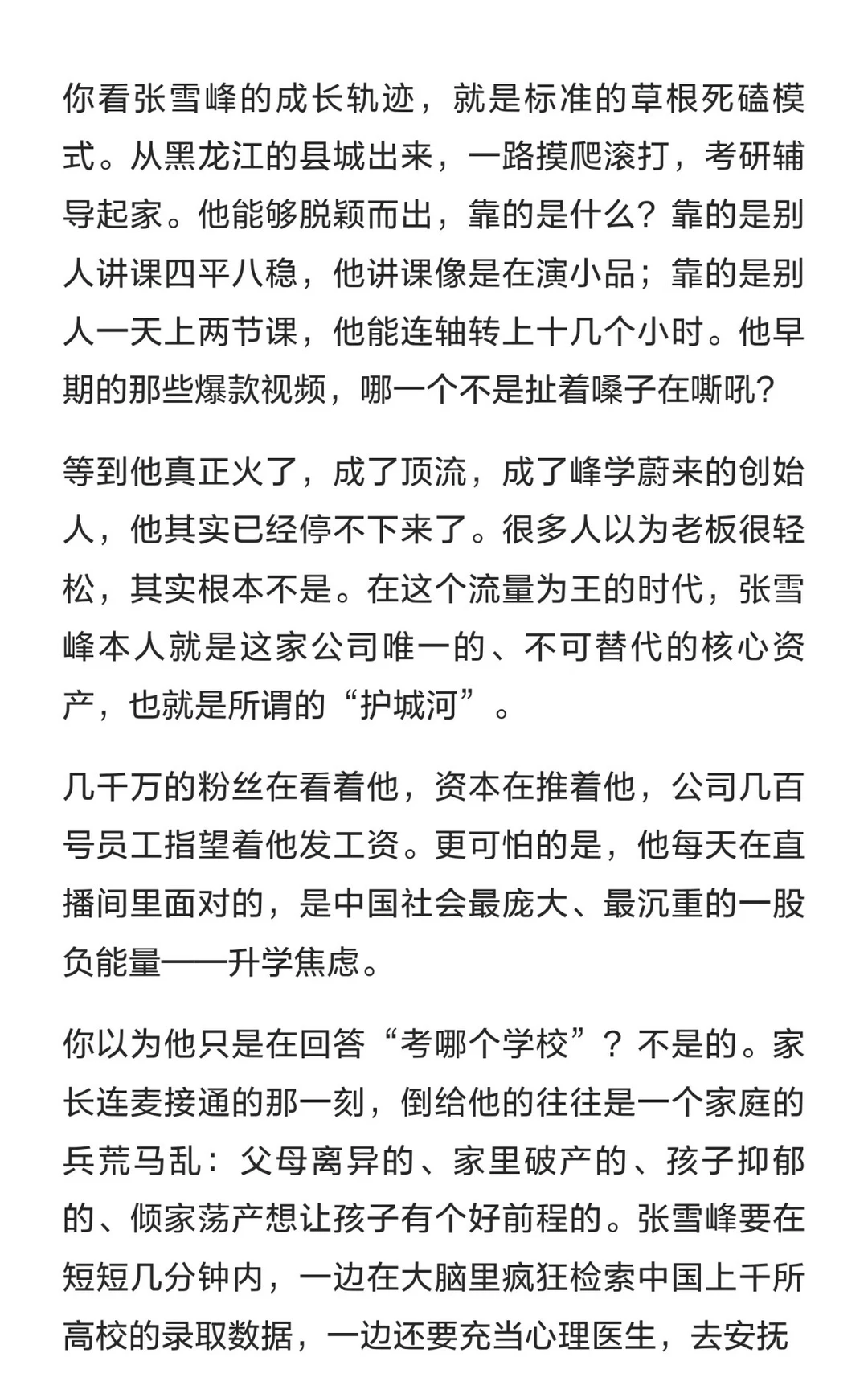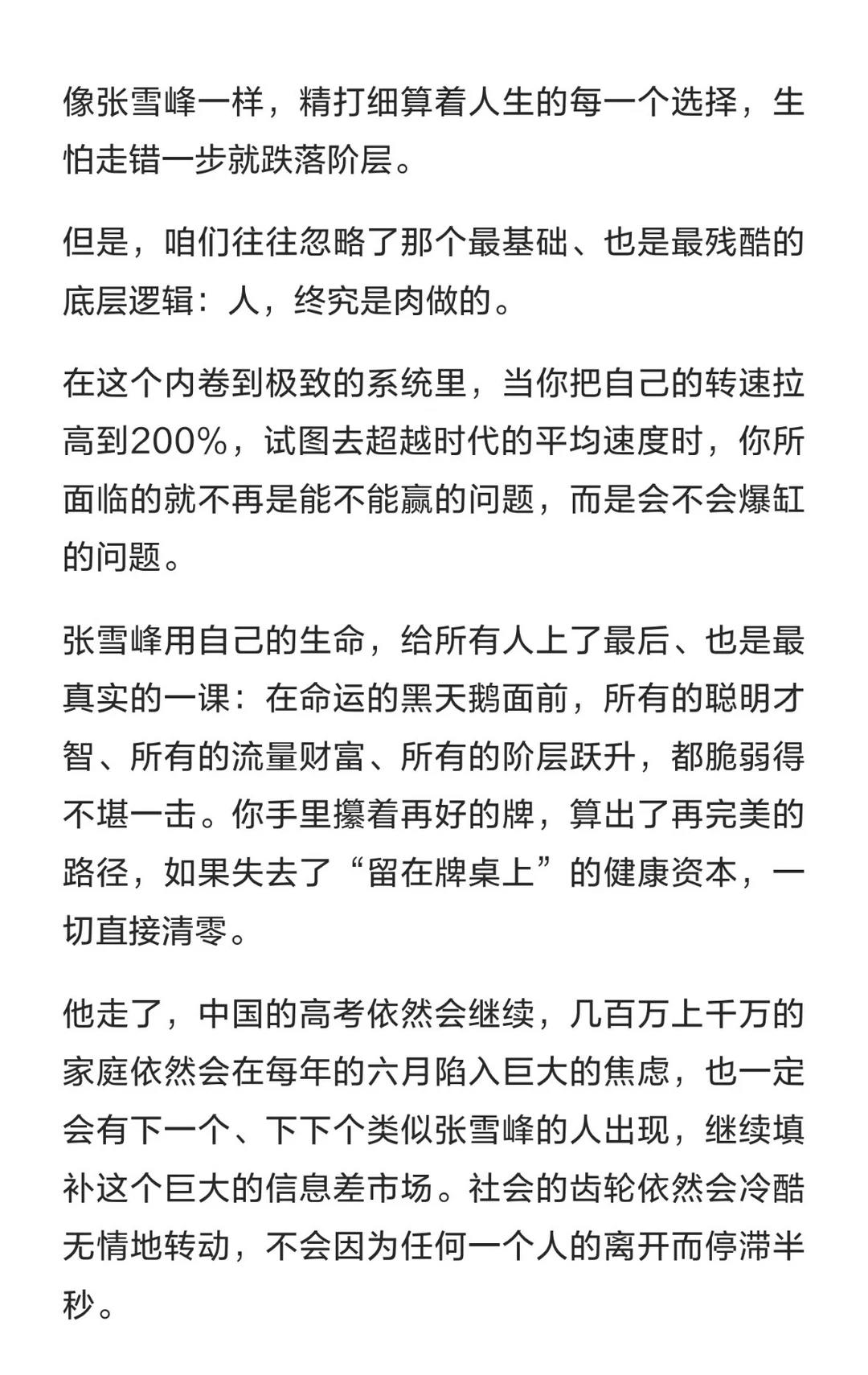 张雪峰通过直播为普通家庭提供高考志愿指导,帮助他们应对升学焦虑。他的离去揭示了中国社会中不同家庭在阶层跃升中的巨大差异,提醒人们在追求成功时,健康与平衡同样重要。 来源:乔松观 ·