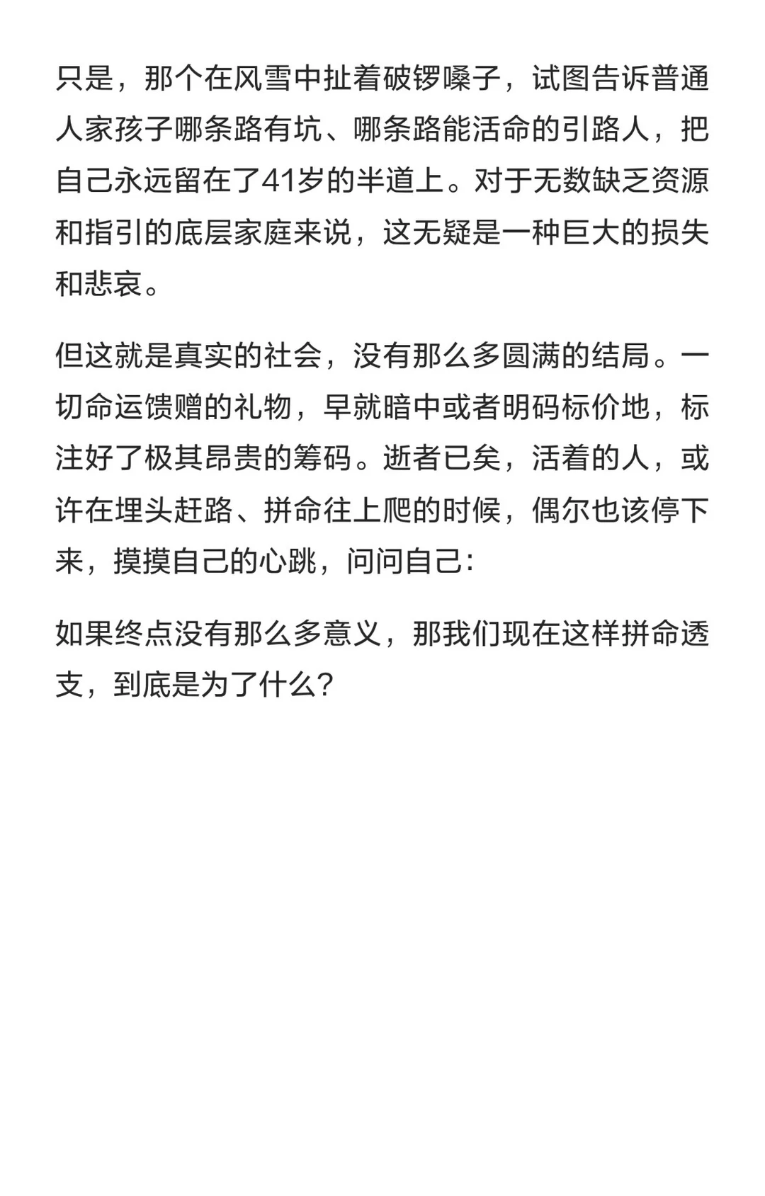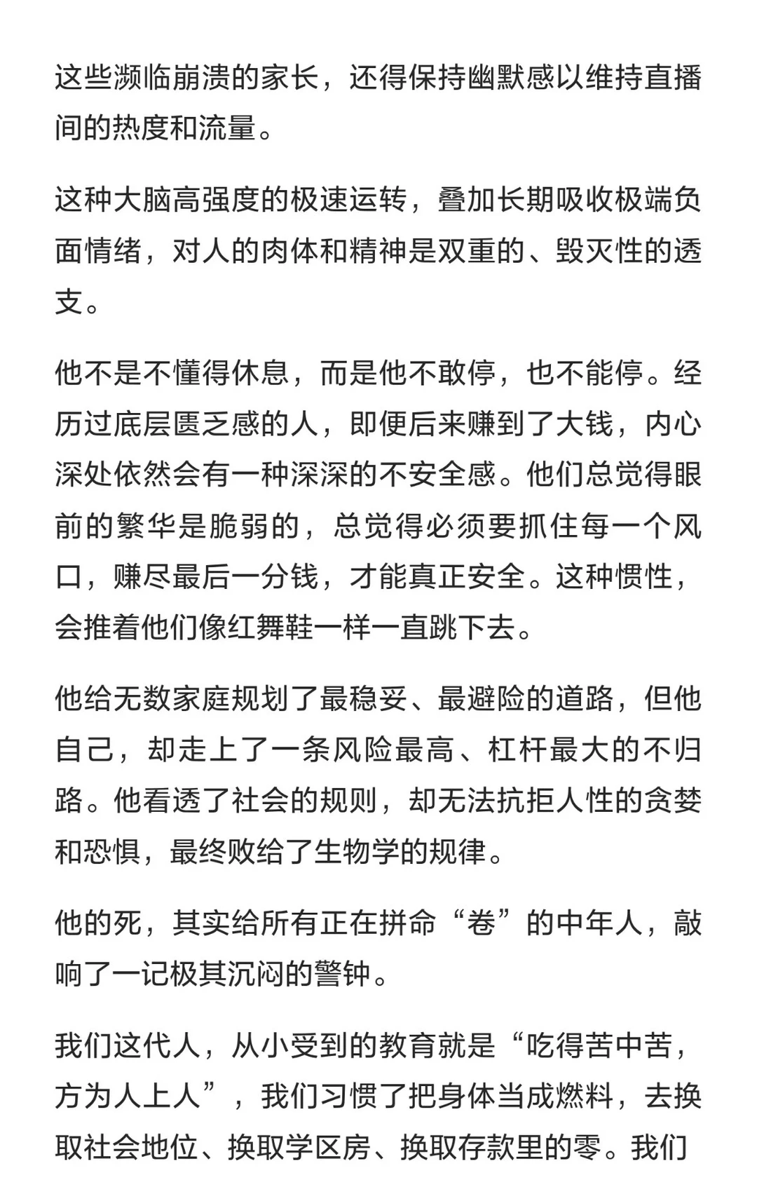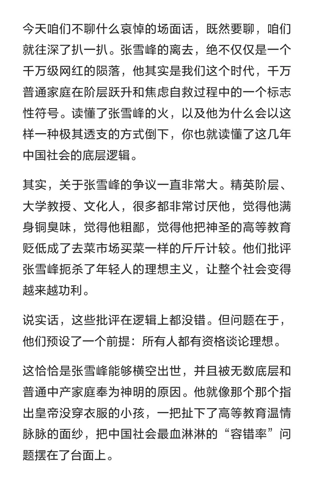 张雪峰通过直播为普通家庭提供高考志愿指导,帮助他们应对升学焦虑。他的离去揭示了中国社会中不同家庭在阶层跃升中的巨大差异,提醒人们在追求成功时,健康与平衡同样重要。 来源:乔松观 ·