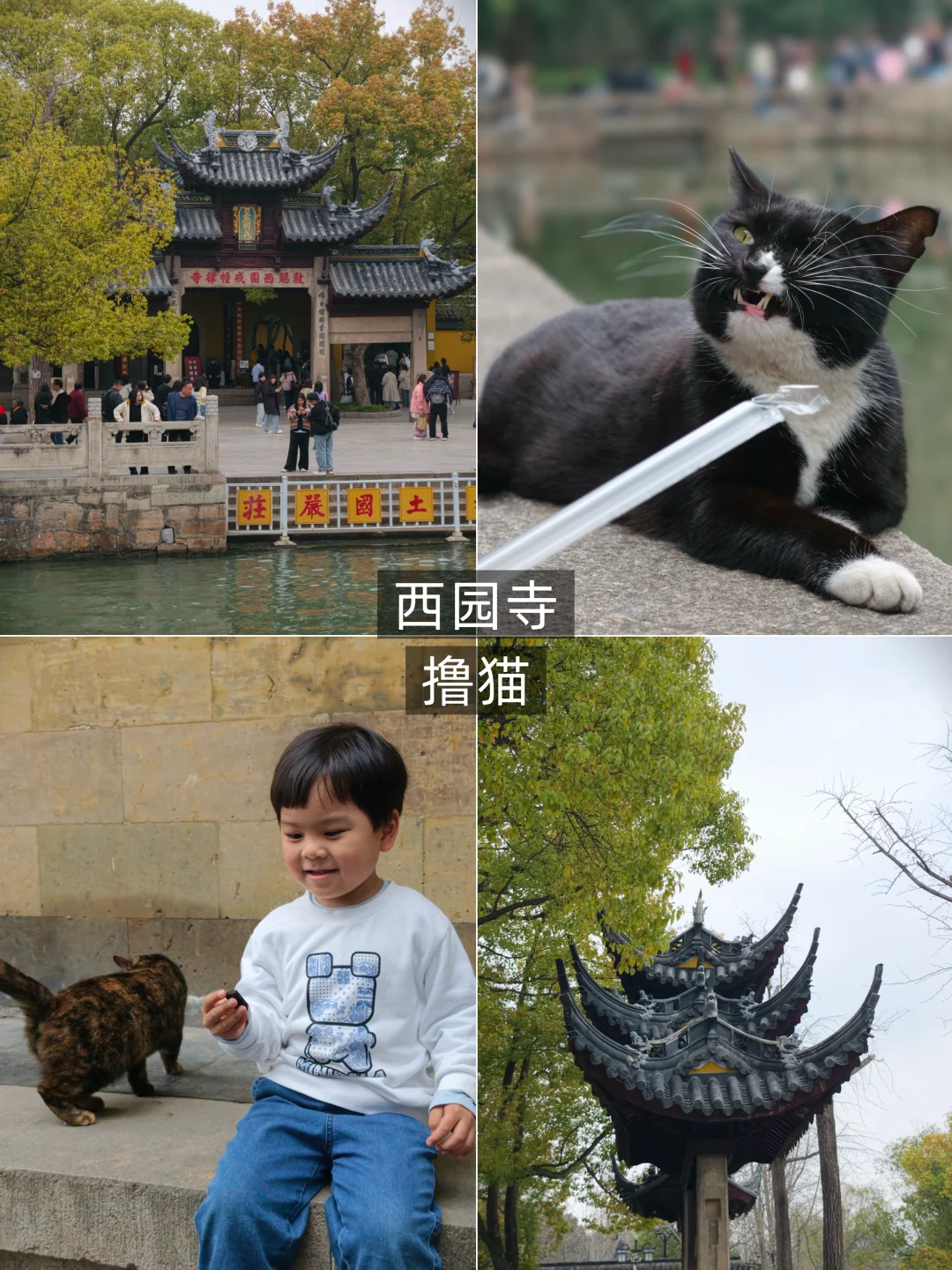 第二天抽空去了西园寺,古刹清幽,猫咪慵懒地晒太阳,温柔又亲人,语泽小心翼翼地撸猫,画面软萌又治愈,寺庙里的素面也超好吃,清淡养胃。