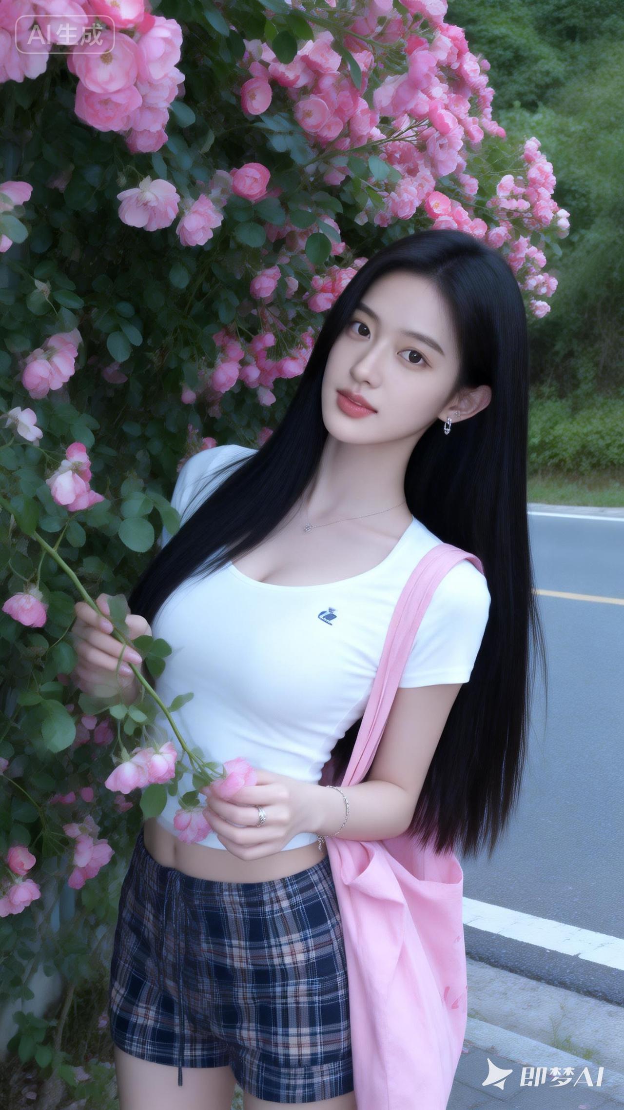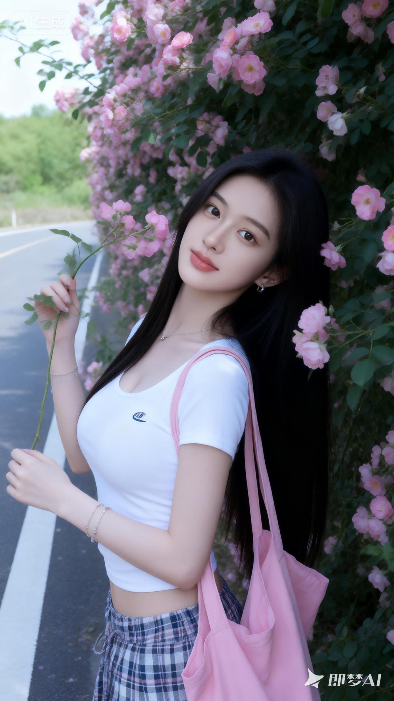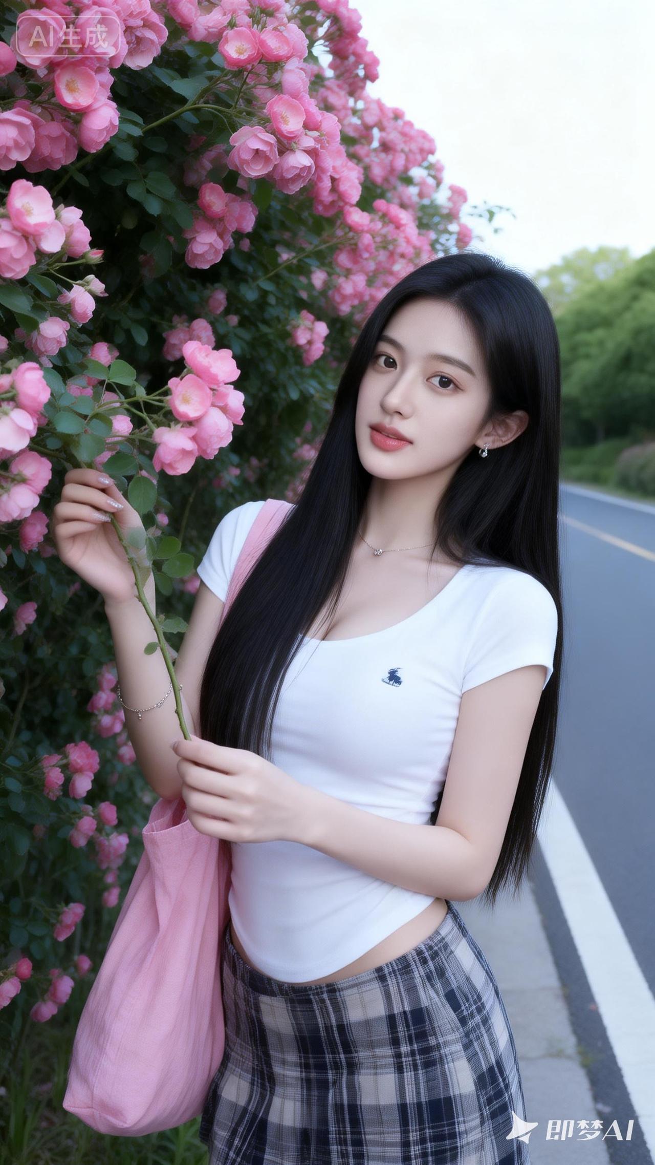 在花丛中,少女手持玫瑰,清新自然,美不胜收。