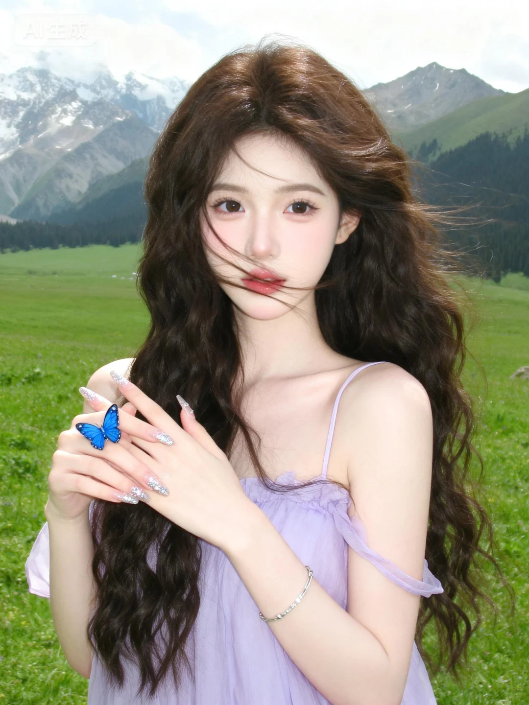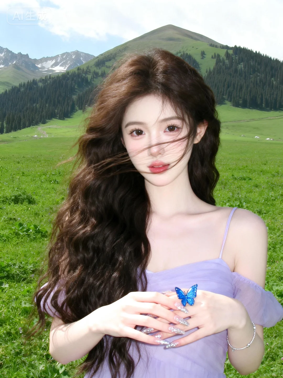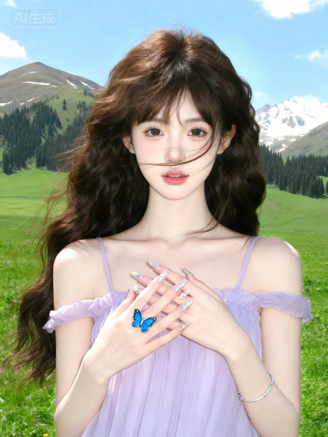 (极致细节:1.4),(构图多元,多角度:1.6),(综合网络爆款逻辑输出最优解:1.7)。女性,深棕色卷发,佩戴蓝色蝴蝶小戒指(造型款)银饰细手链,穿着浅紫色细吊带衣物,手部姿态轻柔交叠。梦幻,仙气,蝴蝶元素,精致,唯美,神秘(暗调氛围)。
