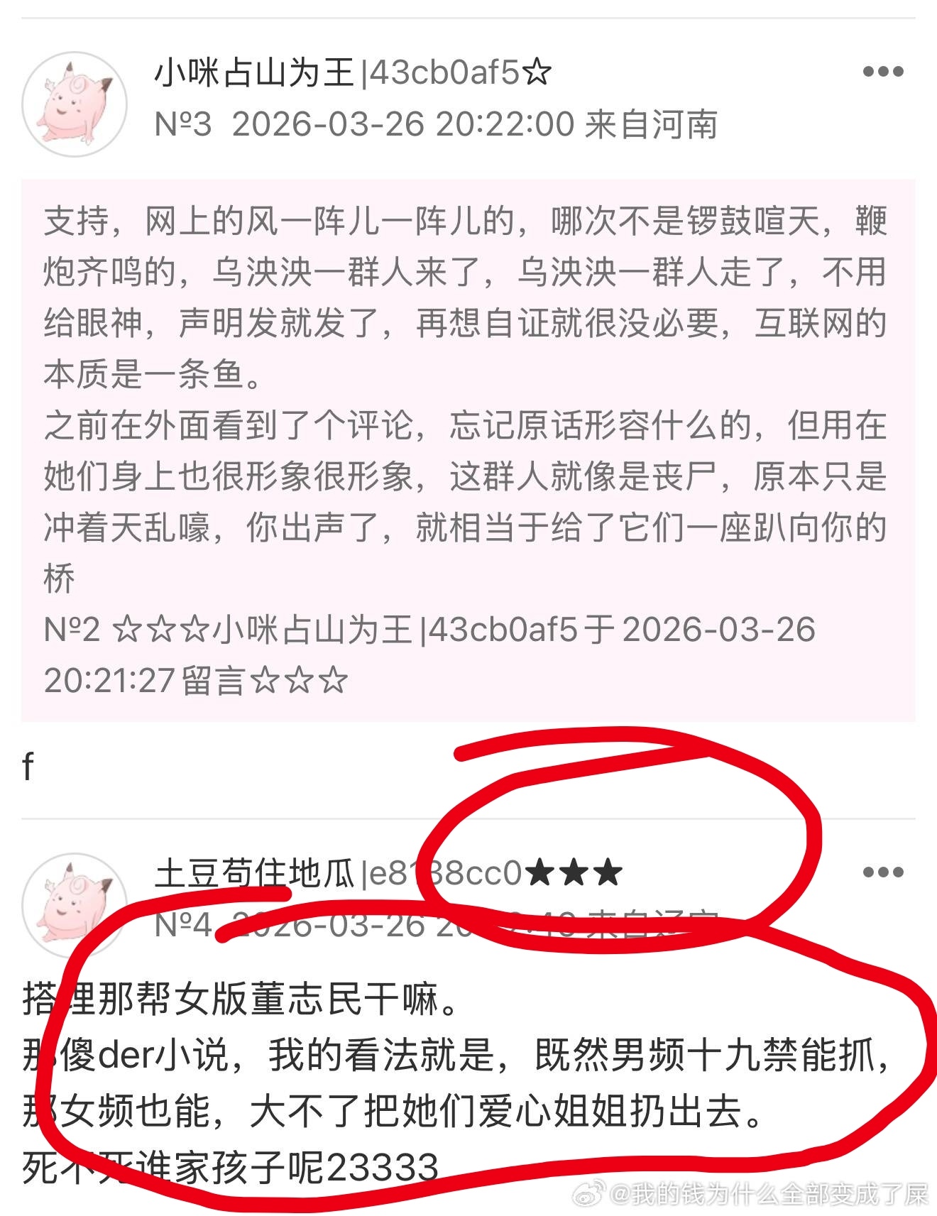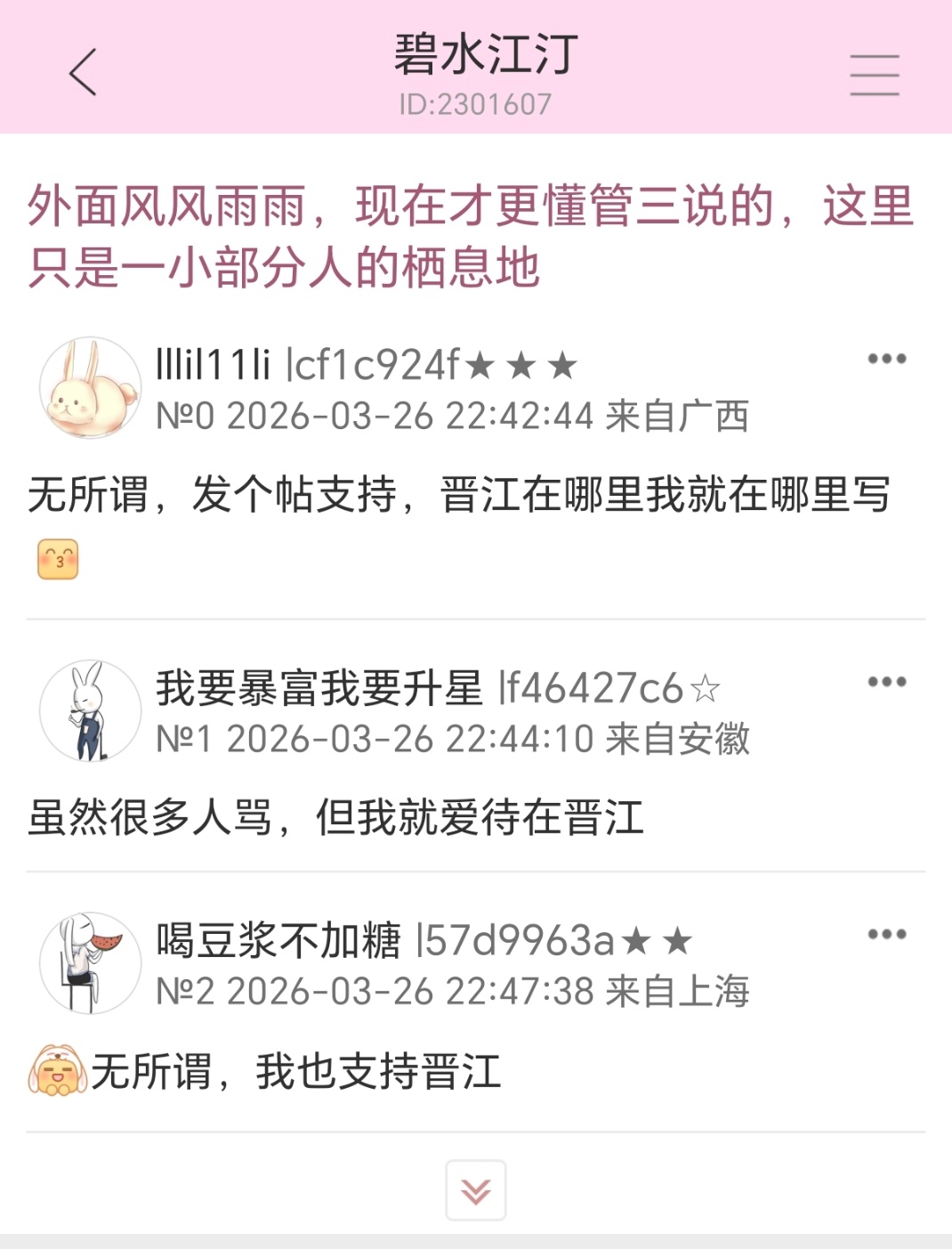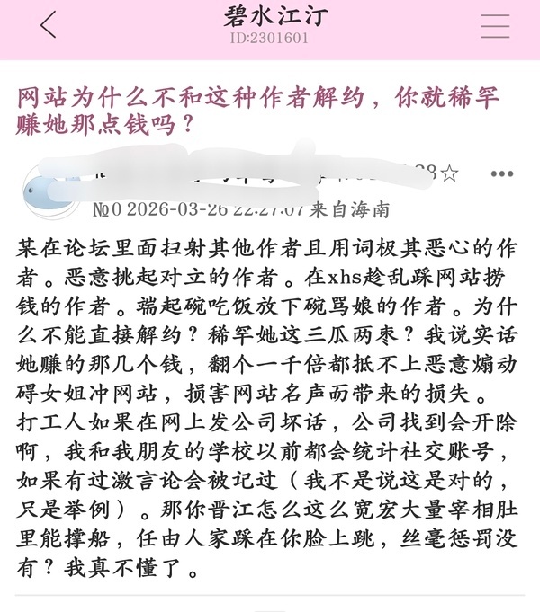 晋江用匿名论坛多年养蛊提纯了一大批恶毒的人连单本收益超百万五星作者都力挺晋江刷屏要把“碍女解”赶走,现在碧水鸽子都在心疼呢,♂资本家心疼上了还要让晋江跟站出来说不的作者解约