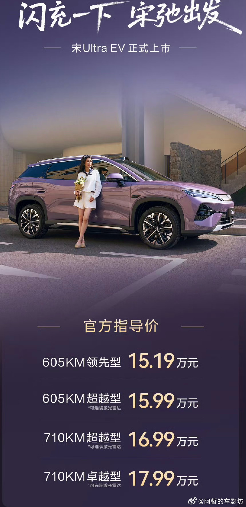 宋Ultra EV分4款配置650km领先型 15.19万650km 超越型 15.99万710km 超越型 16.99万710km 卓越型 17.99万大v聊车大v聊车宋Ultra全系标配闪充15.19万起