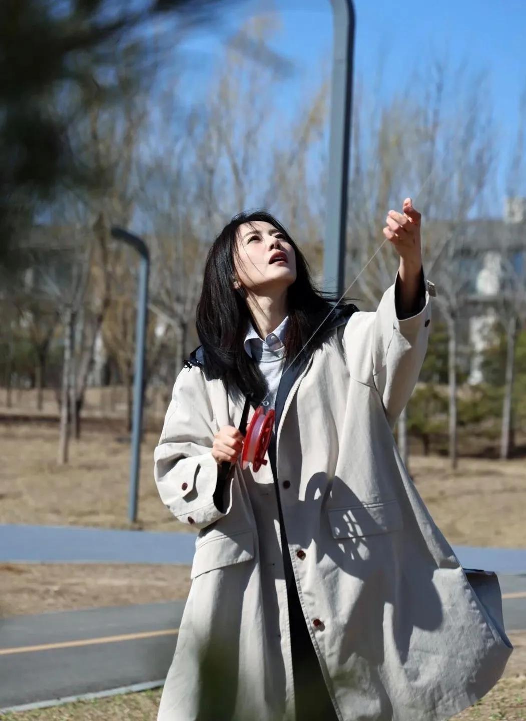 高圆圆这组春游照太治愈了!浅卡其色风衣+牛仔裤+红色德训鞋,简约又松弛,把春日氛