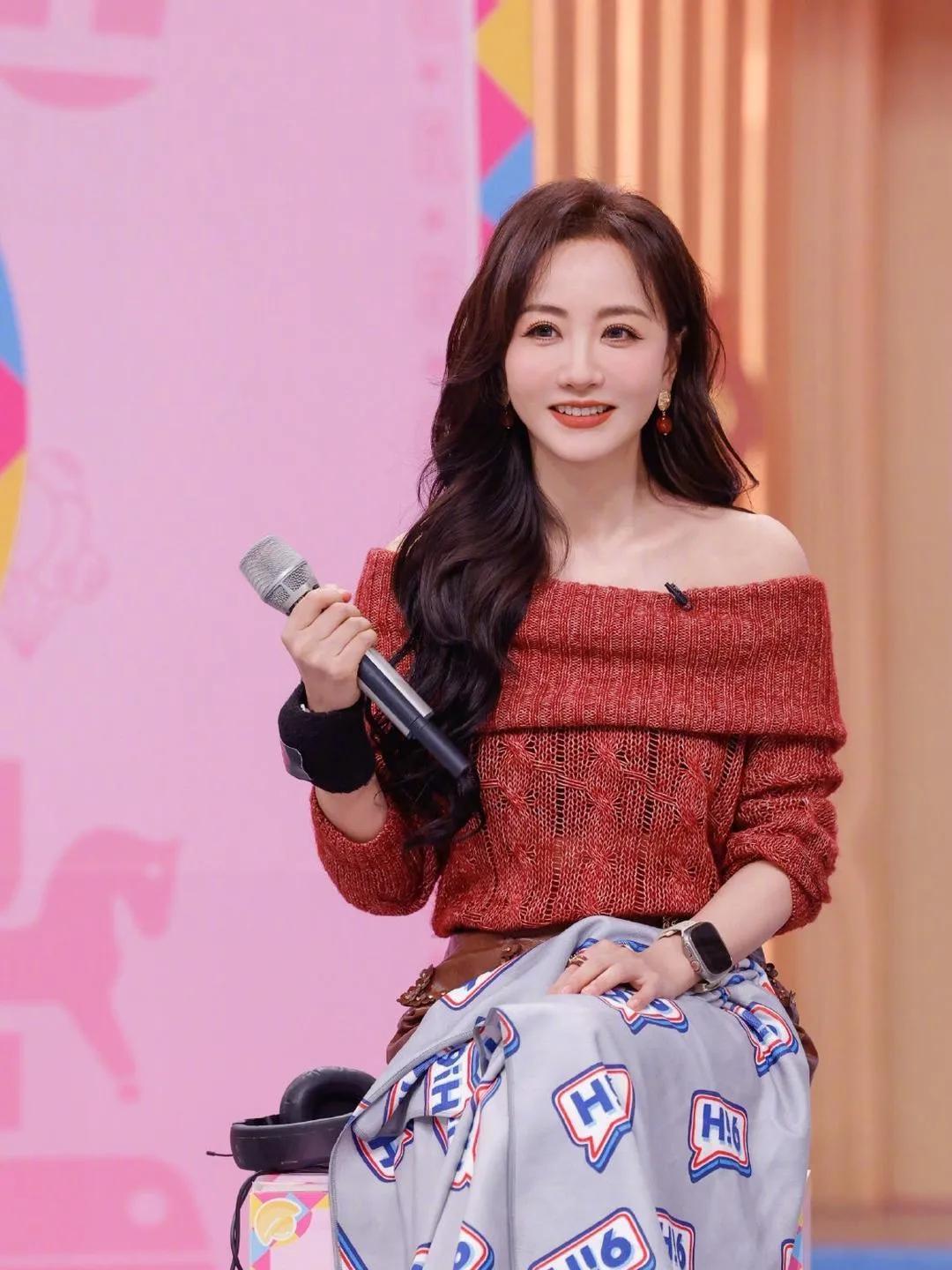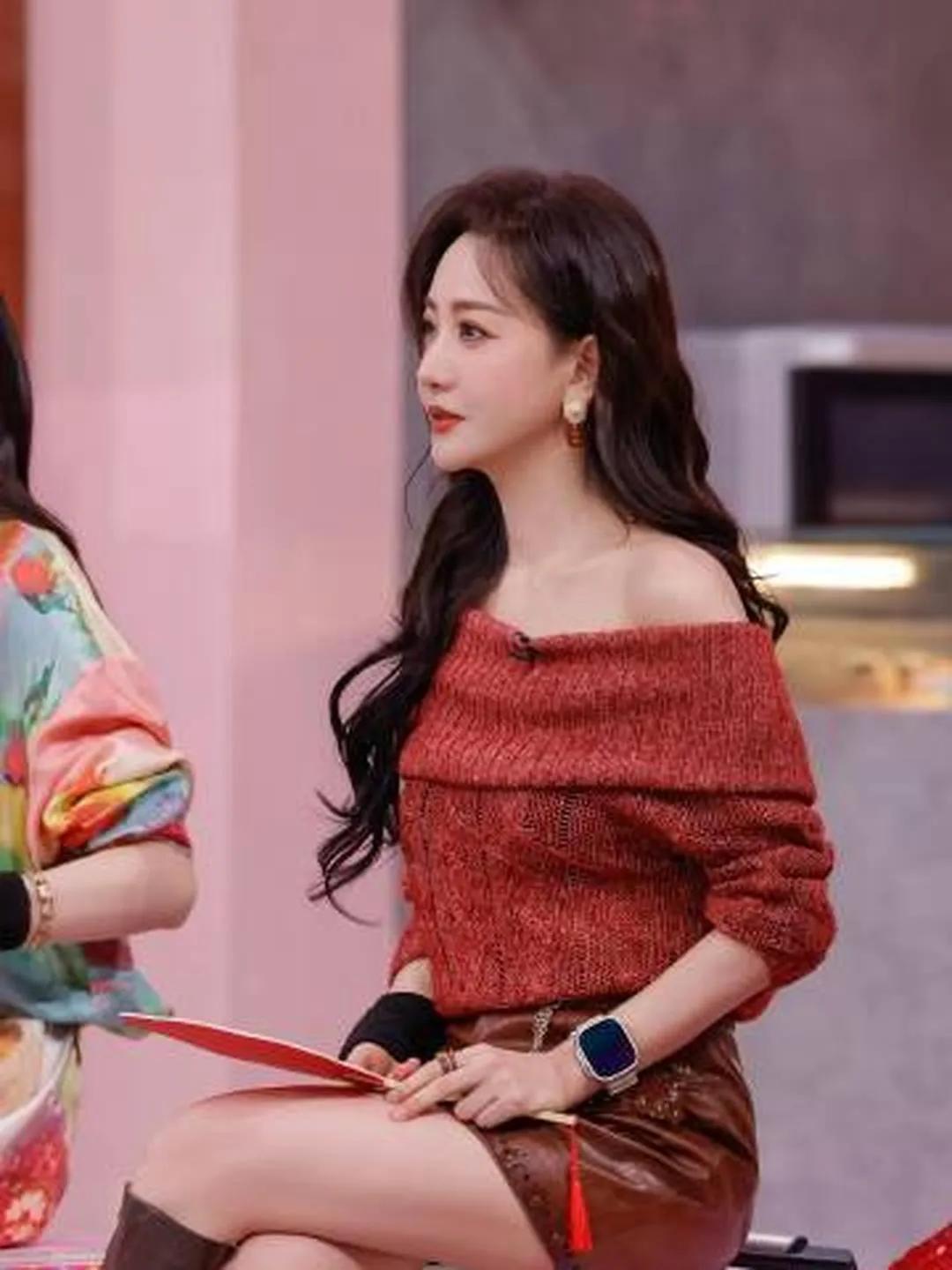 被杨蓉这套穿搭狠狠圈粉! 酒红针织衫+棕色皮裙,颜色温暖又显白,一字肩藏住拜拜肉