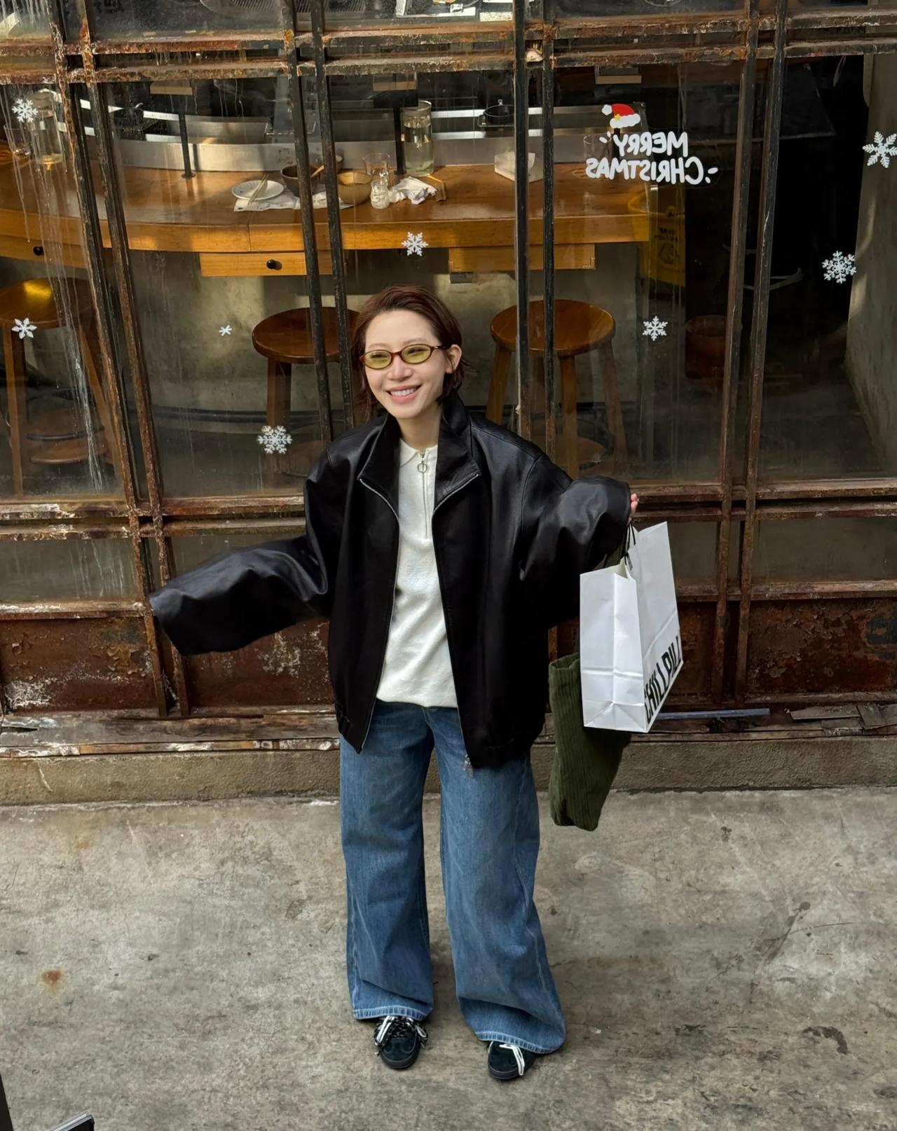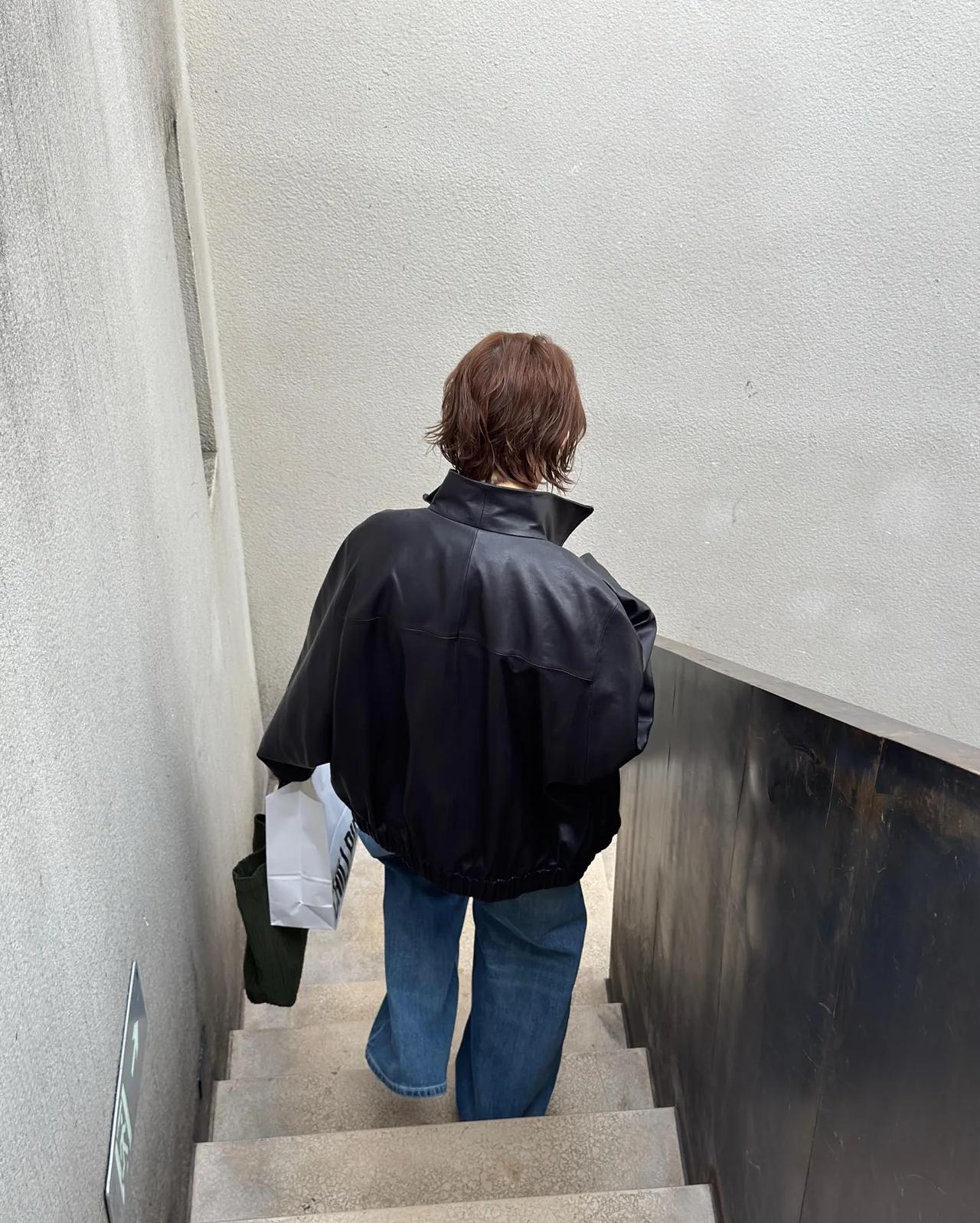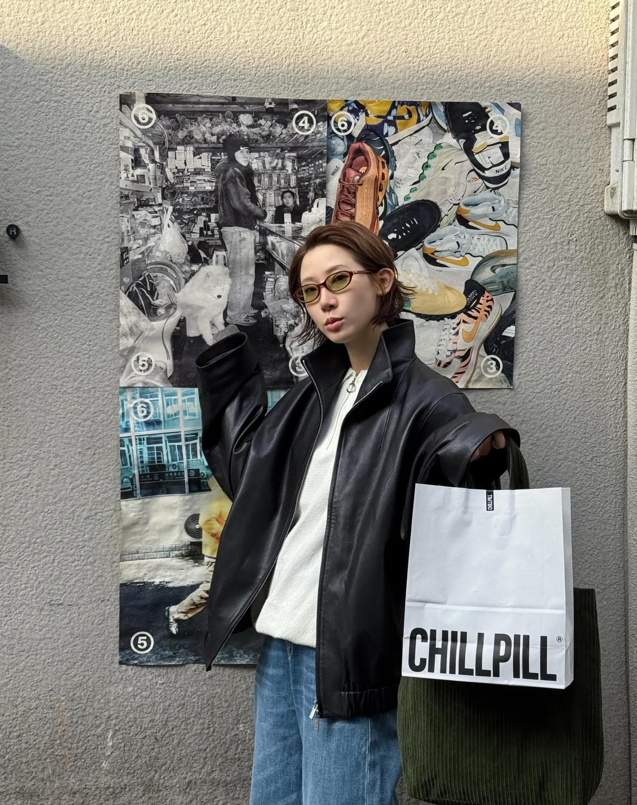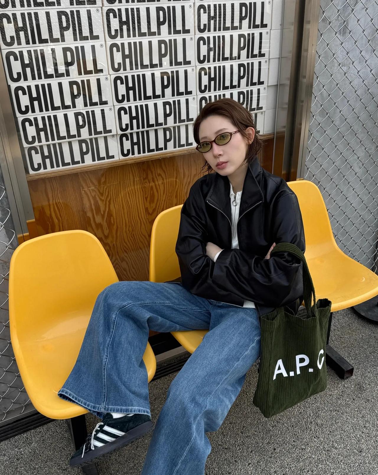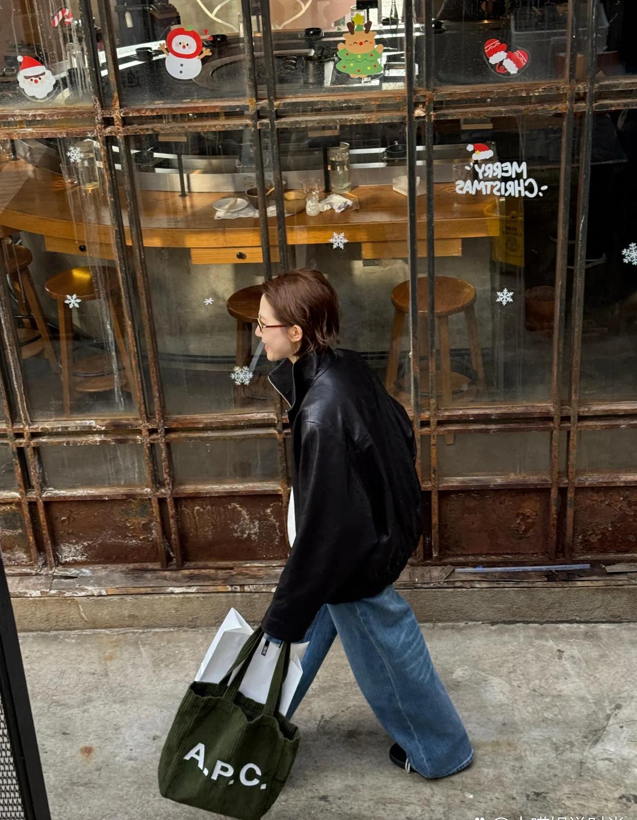 谁穿谁好看的皮衣公式!✨ 黑皮衣+白内搭+蓝阔腿裤,复古德训鞋+绿托特包,慵懒随