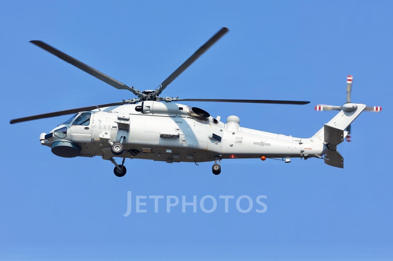 一架Z-20F舰载反潜直升机,堪称最清晰的图片之一。机身左侧通常安装有声呐浮标发射器,机身下方可以看到吊放式声呐舱。