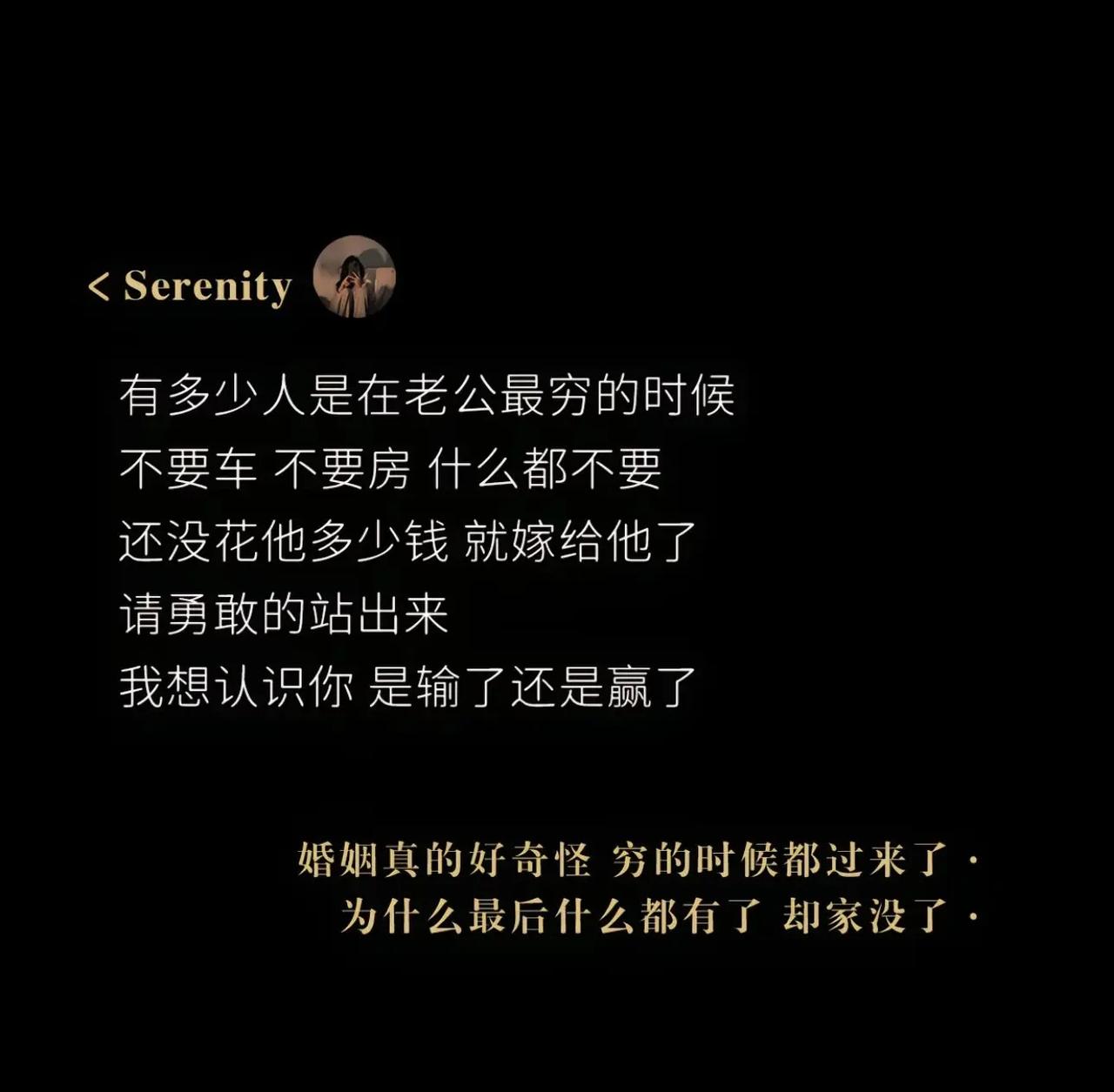 没有一分彩礼,没有金,没拿过钱,什么都没有什么都不图,最后输得一塌糊涂,只得到了一身的债务,还不完的债务,我真的谢谢你!婚姻 婚姻情感