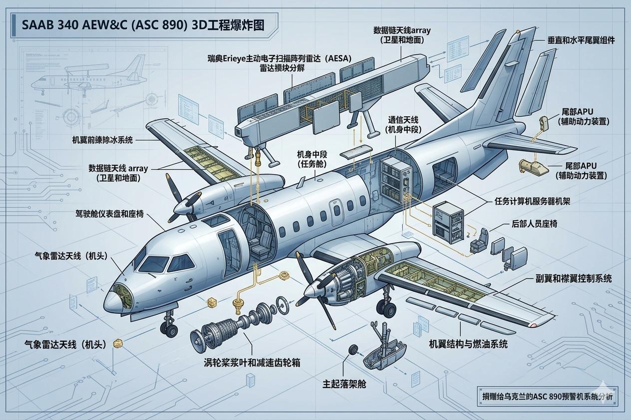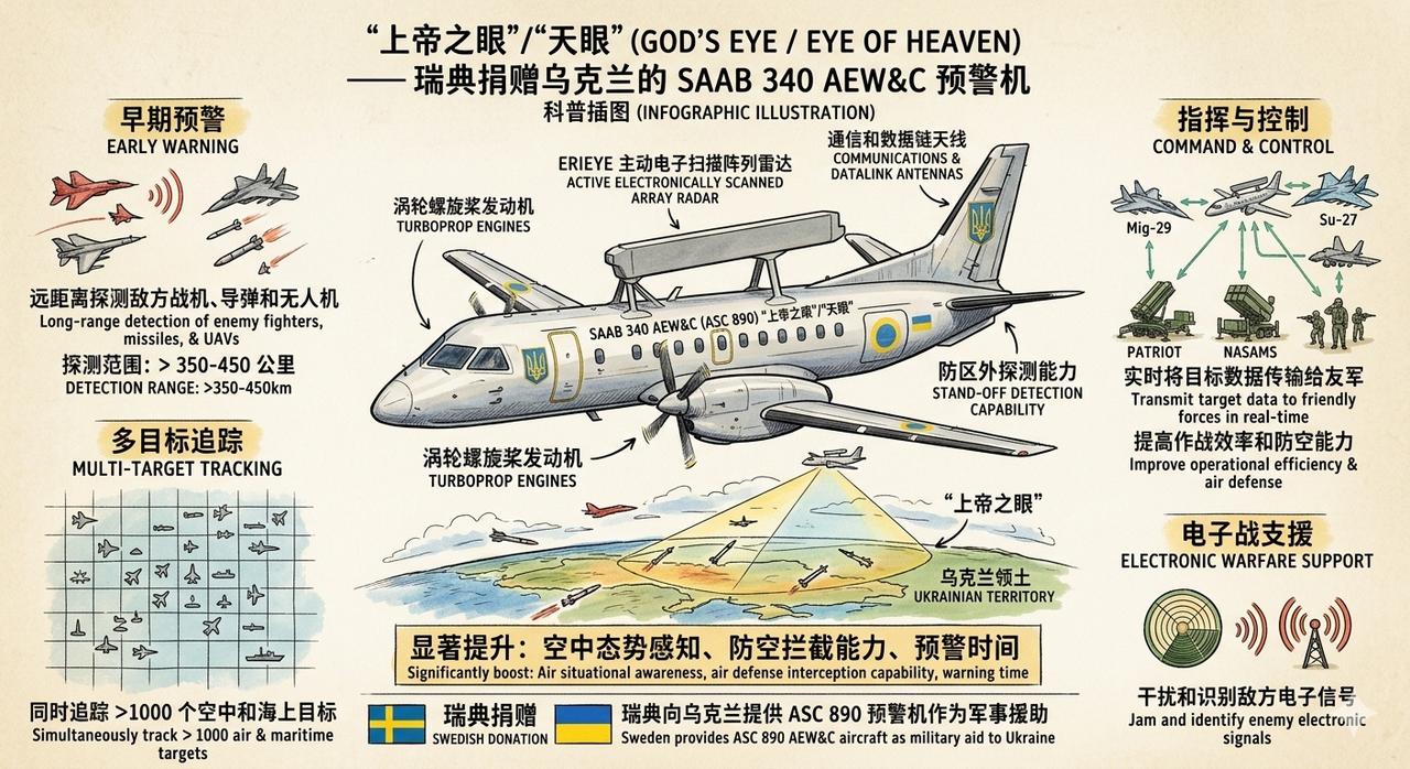 乌克兰“上帝之眼”首现身!萨博340预警机入场。 2024年5月,瑞典宣布作为军援的一部分,将其空军仅有的两架S 100D Argus(ASC 890)捐赠给乌克兰。这是西方首次向乌克兰提供空中预警与控制(AEW&C)平台。交付前需约一年时间进行机组培训和地面设施准备。 2026年3月20日前后,社交媒体上出现一段视频,显示这架飞机在乌克兰上空飞行,机背有明显的“平衡木”状雷达罩,这是其首次被公开目击,标志着它可能已投入实际使用。 这款预警机的“灵魂”是机背安装的Erieye PS-890有源相控阵(AESA)雷达,外观像一根长条形“平衡木”,非旋转式圆盘雷达。 在理想条件下,对战斗机大小目标约300-400公里(部分来源提到对小型目标可达450公里),对巡航导弹、无人机等低空目标也有良好“俯视”能力。监视面积可超50万平方公里,同时跟踪数百个空中/地面/海上目标。 S波段AESA雷达,电子扫描,无需机械旋转,抗干扰能力强,能在恶劣天气下工作。可动态调整扫描区域(侧向各约120-160度),前方和后方存在一定盲区(这是固定相控阵雷达的常见局限)。 不像美国E-3“哨兵”那样用旋转大圆盘雷达,Erieye更轻便、阻力小、成本低,但覆盖范围和同时处理能力不如大型喷气式AWACS强。它更适合中低强度或区域性监视。 乌克兰此前主要依赖地面雷达和西方地面/卫星情报,低空巡航导弹、Shahed无人机等威胁难以提前发现。Saab 340能从高空提供“俯视”视角,提前预警俄罗斯来袭目标,帮助防空系统(如爱国者、NASAMS)或F-16更高效拦截。可引导F-16等战机进行超视距拦截,或协调多机行动,显著提升态势感知。 这是乌克兰空中力量的一次质的提升,尤其在俄罗斯A-50预警机数量减少的背景下,能部分“填补”空中指挥空白。不过单靠两架无法彻底改变空中平衡,还需与其他系统配合。
