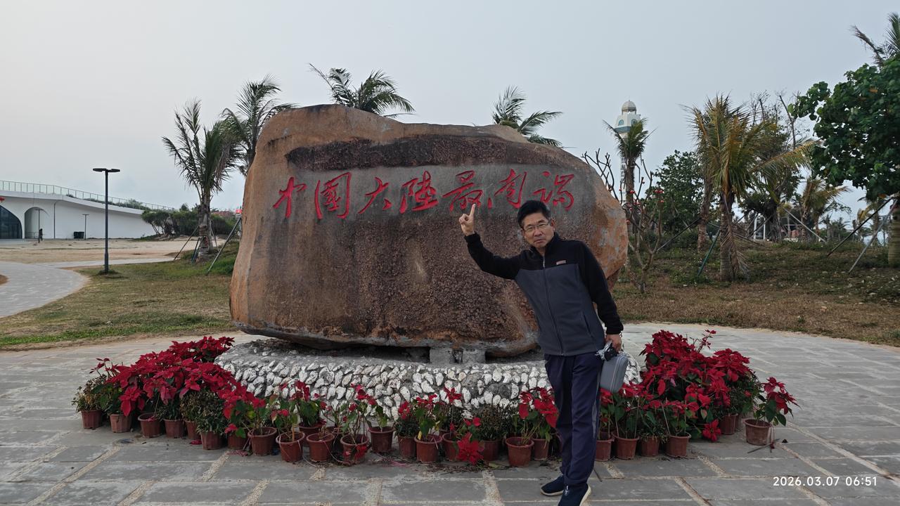 【环国行摄】第三阶段西部篇D21天总第76天:海陵岛—灯楼角。 1.路线:海陵岛—天下第一滩-吴川服务区-湛江市-雷州市-徐闻-灯楼角。 2.今日行驶410公里,累计公里 3.主要景点:天下第一滩,雷州古城,湛江赤坎老街 4.行程: 今天到中国大陆最南端登楼角,全程将近400km。知道今天会很辛苦。所以一早就出发。 先导航中国第一滩、晏镜岭。路上在228国道6366、6433路碑打卡。到了之后那个沙滩也就那么回事儿。要上那个晏镜岭山挺高。看网上也就那么回事吧。无非是登高望远,看海景。没有什么特别的。 路过茂名市南,懒得到市区里,有点远,市区也没有什么值得看的。茂名是全国重要的石油化工基地和能源基地,粤西综合性枢纽城市和沿海重要的港口。 稍事停留之后走人。继续导航湛江火车站。已经好长时间没有洗澡了,又攒了好多脏衣服。所以决定走一段高速。上高速之后在服务区打了凉水开水。洗了衣服,洗了澡,一下子痛快了很多。 路过玛珥湖路口,放弃进去了。“玛珥”一词来源于德文Maar的音译,原意为“海”,特指一种由火山爆发形成的低平火山口中积水而成的封闭湖泊。玛珥湖区别于其它火山口湖的特点是平地爆发,蒸汽、泥石同时喷发后形成火山口。世界上两个最为典型的玛珥湖—中国广东湛江市湖光岩玛珥湖与德国艾菲尔地区玛珥湖。它的形成源于16万年前这里的火山爆发,岩浆喷发后,喷发物堆积在喷出口周围形成犹如围墙的火山碎屑岩环,喷发中心则形成深而圆的盆地,而后积水成湖。但从网上看,景色平平,门票还贵,直接放弃。 之后到湛江赤坎老街,天气很热,和夏天差不多。这个老街太普通了,转了一圈,也没看出有什么特别的,走人。直接导航雷州古城。国道上车非常多,特别是大车很多。虽然路很宽,但开起来非常不爽。到了古城,也没看到什么。只是大街上骑摩托车的横七竖八,真的和蚂蚁一样,一片一片的。不由感叹,人实在太渺小了。 因为时间已经不早,本想到波罗的海的,但要多绕一个小时。此时已经下午4点,已经不现实了。今天必须赶到灯楼脚,太晚了,露营地也不好找了。所以一直向南,路过徐闻县城,都没有停留。就这样赶到灯楼角时,天也已经黑了。匆匆到里面转了一圈,地方倒是挺大。 晚上包了饺子吃。 5.住宿:灯楼脚停车场露营。2026.3.6 6.路况:好,国道车太多。 7.天气温度:晴天,15-23度