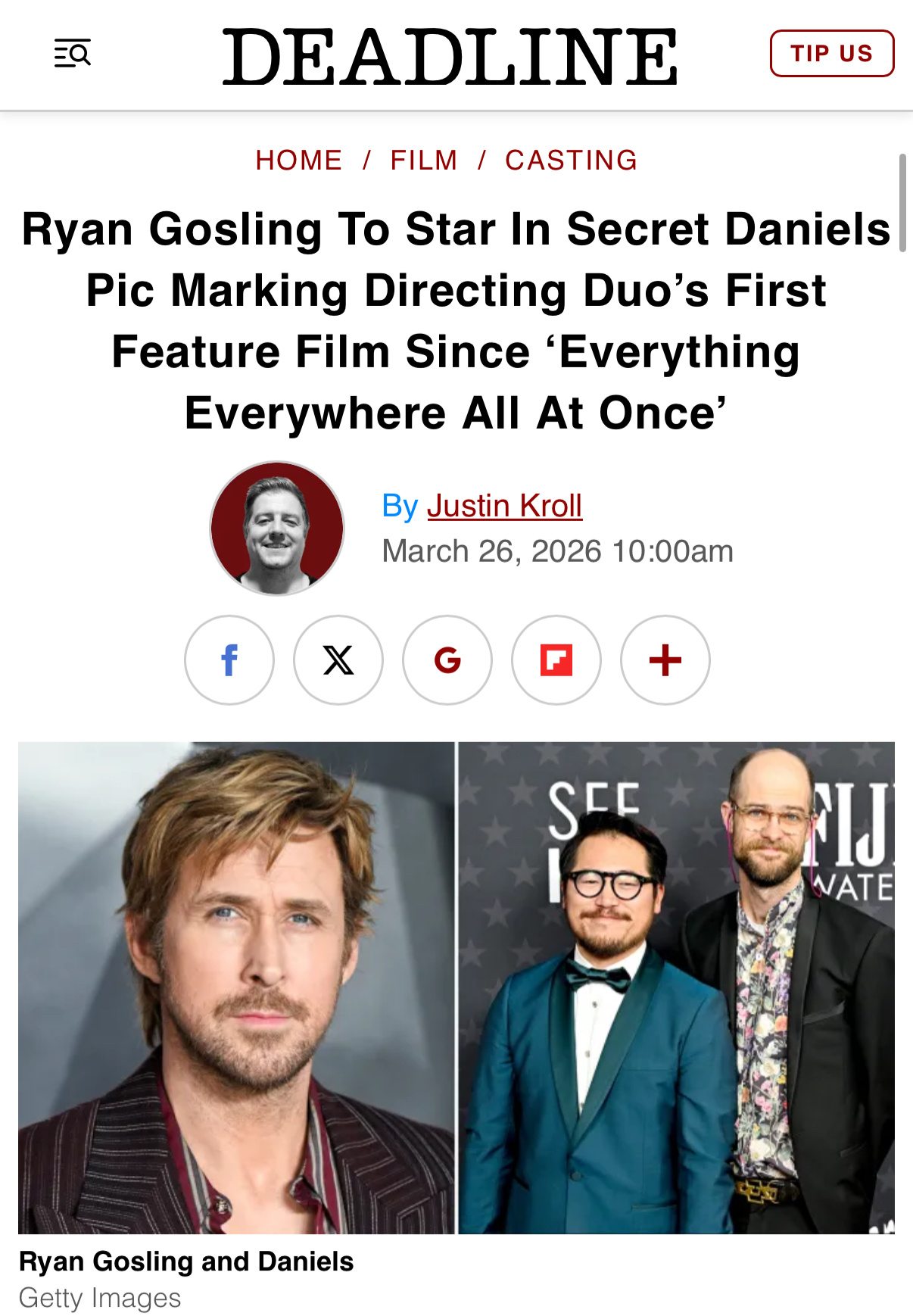 好诶!Deadline报道,瑞恩·高斯林将主演《瞬息全宇宙》导演关家永 / 丹尼尔·施纳特的新片,目前还处于保密状态,不过导演曾描述这部新片是“一部有趣的科幻动作喜剧,充满温情,非常存在主义。”该片今年夏天开拍,明年11月19日上映。